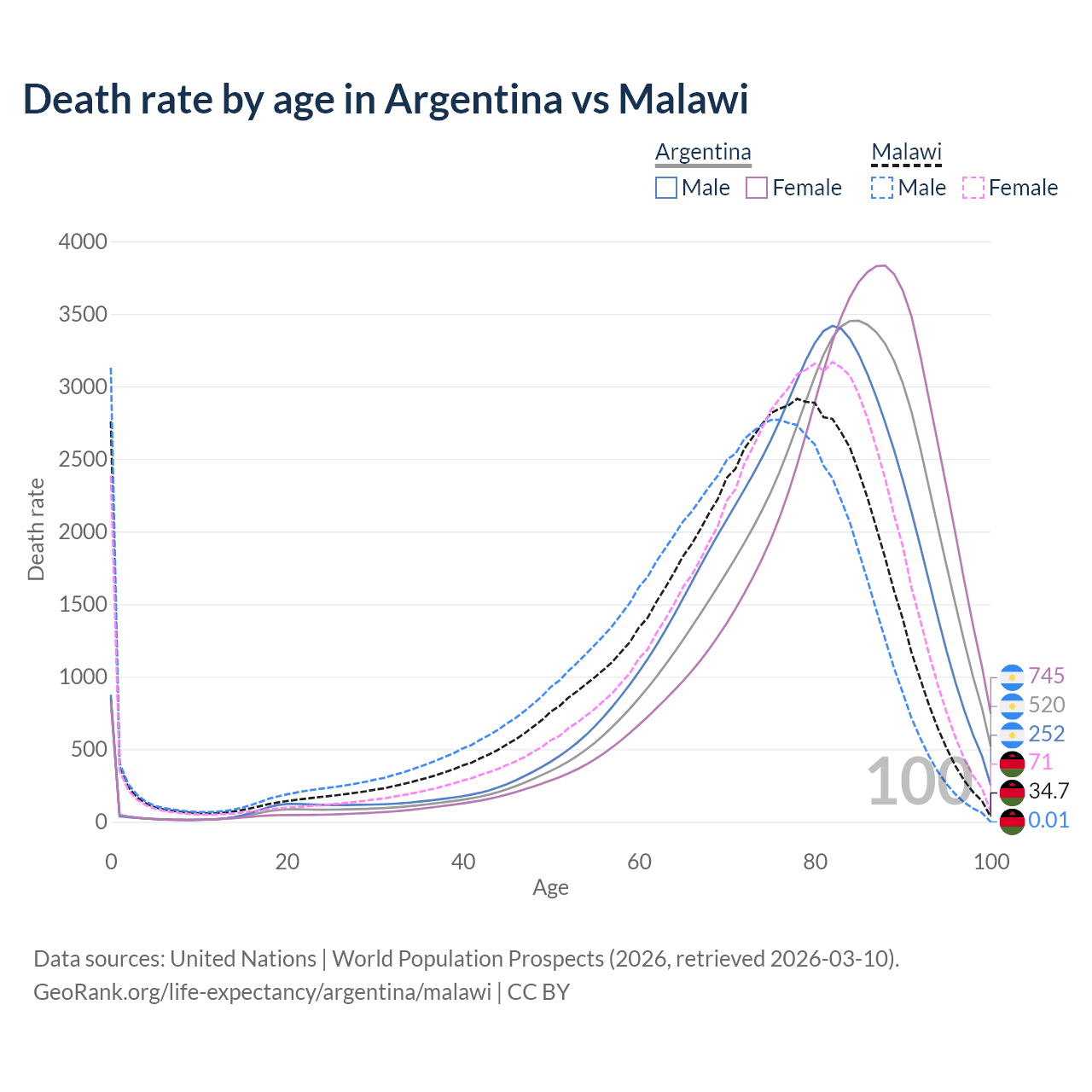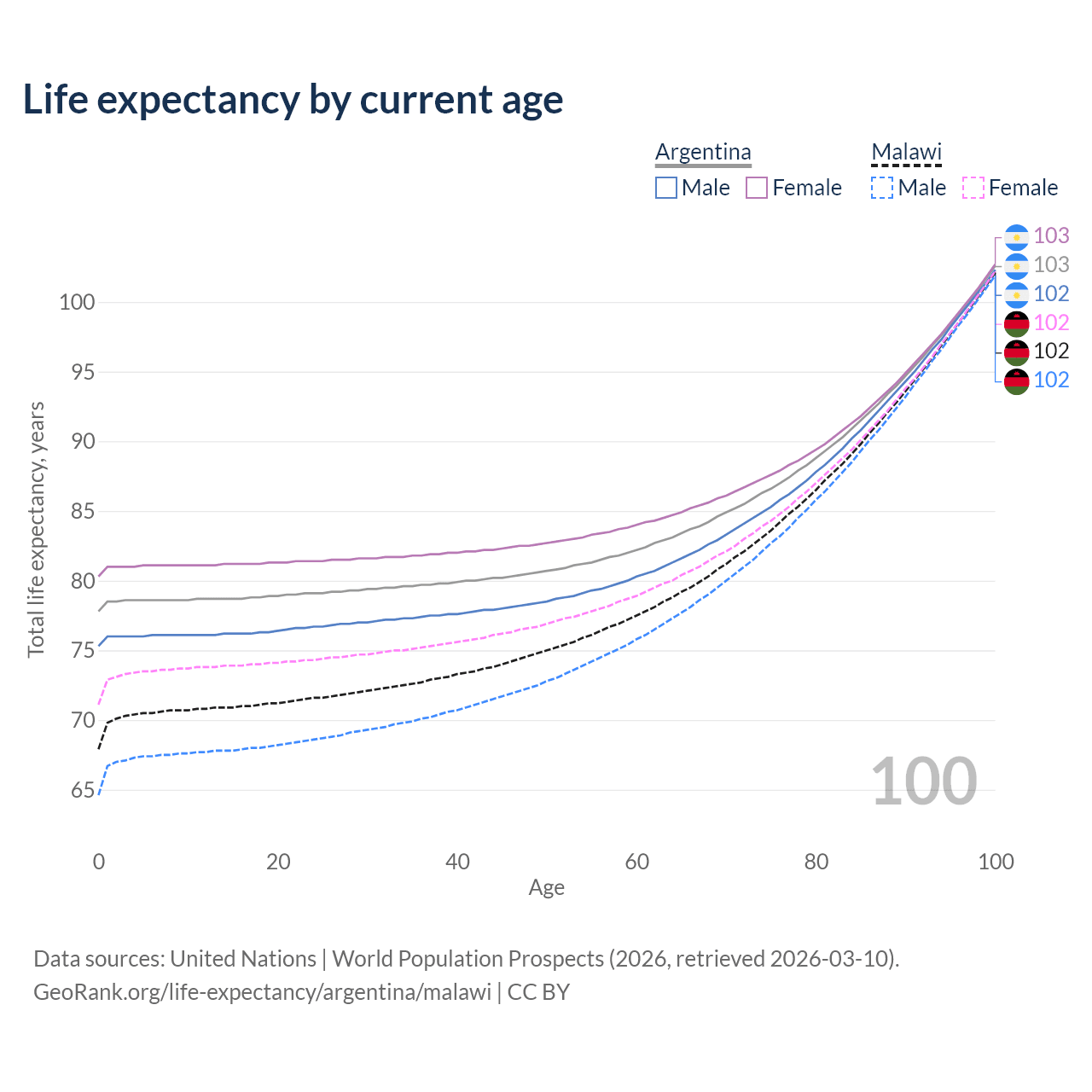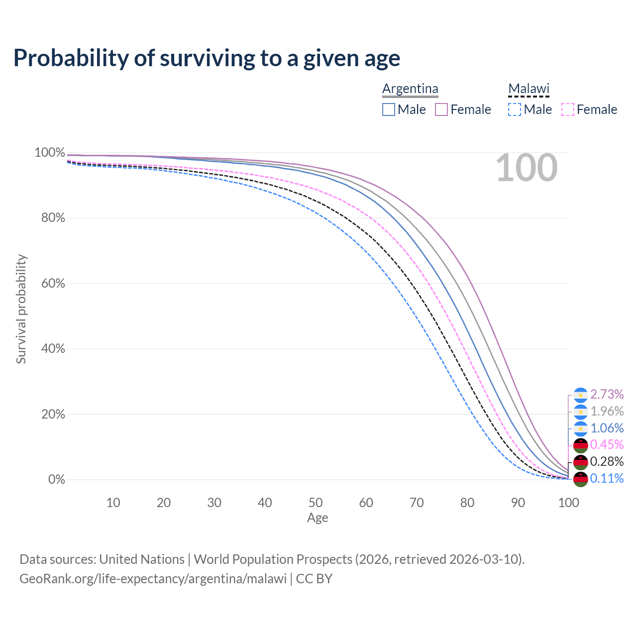 This life expectancy calculator shows the odds of living to 100, 95, 90, and below based on current age for both males and females in Argentina and Malawi, along with mean and median age of death. The calculations are based on the 2026 life tables (actuarial tables) from the UN World Population Prospects.