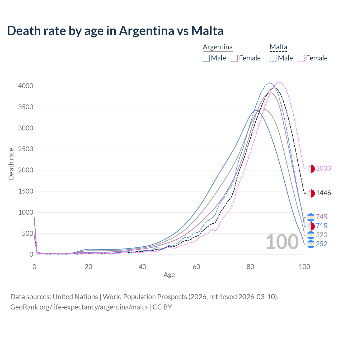 This life expectancy calculator shows the odds of living to 100, 95, 90, and below based on current age for both males and females in Argentina and Malta, along with mean and median age of death. The calculations are based on the 2026 life tables (actuarial tables) from the UN World Population Prospects.
