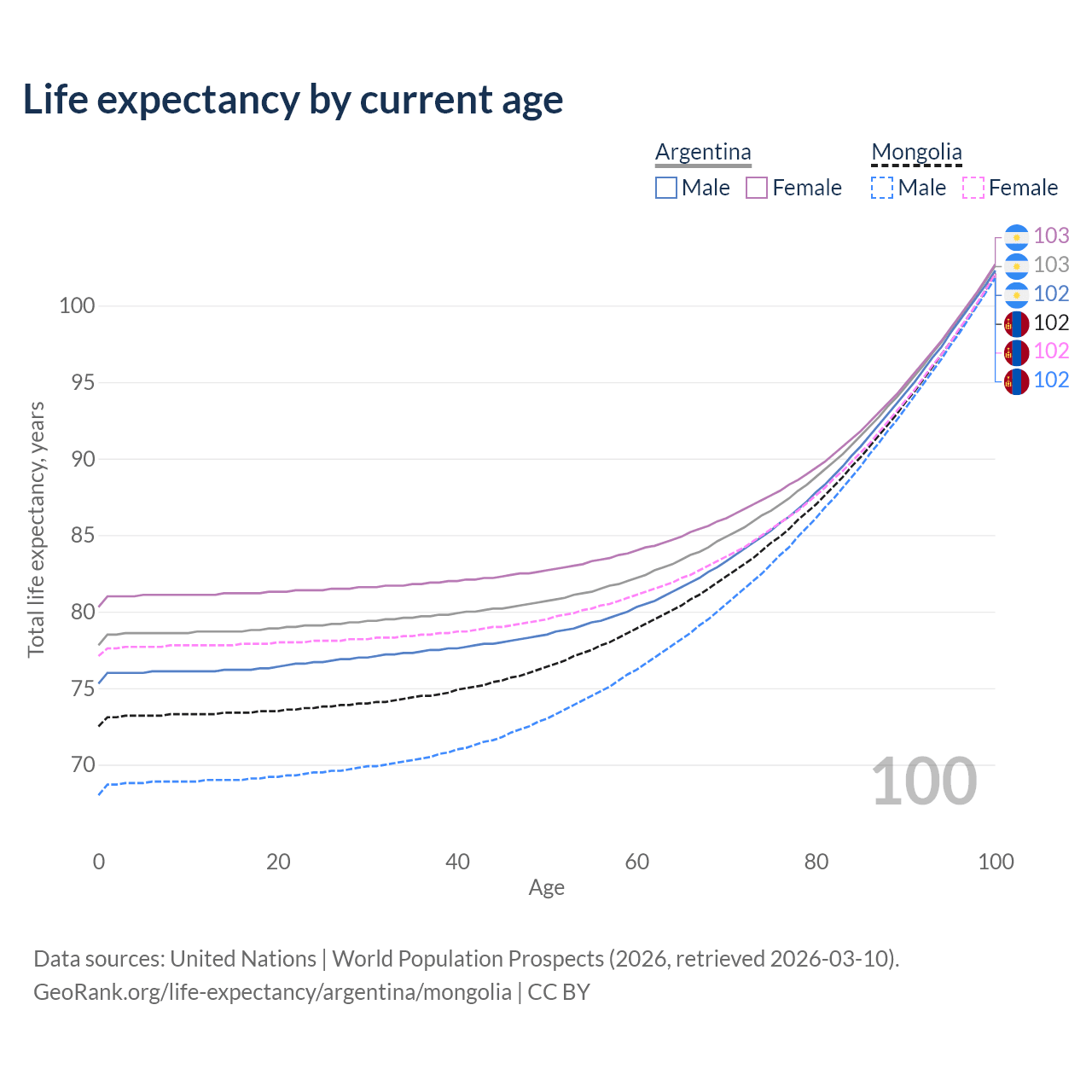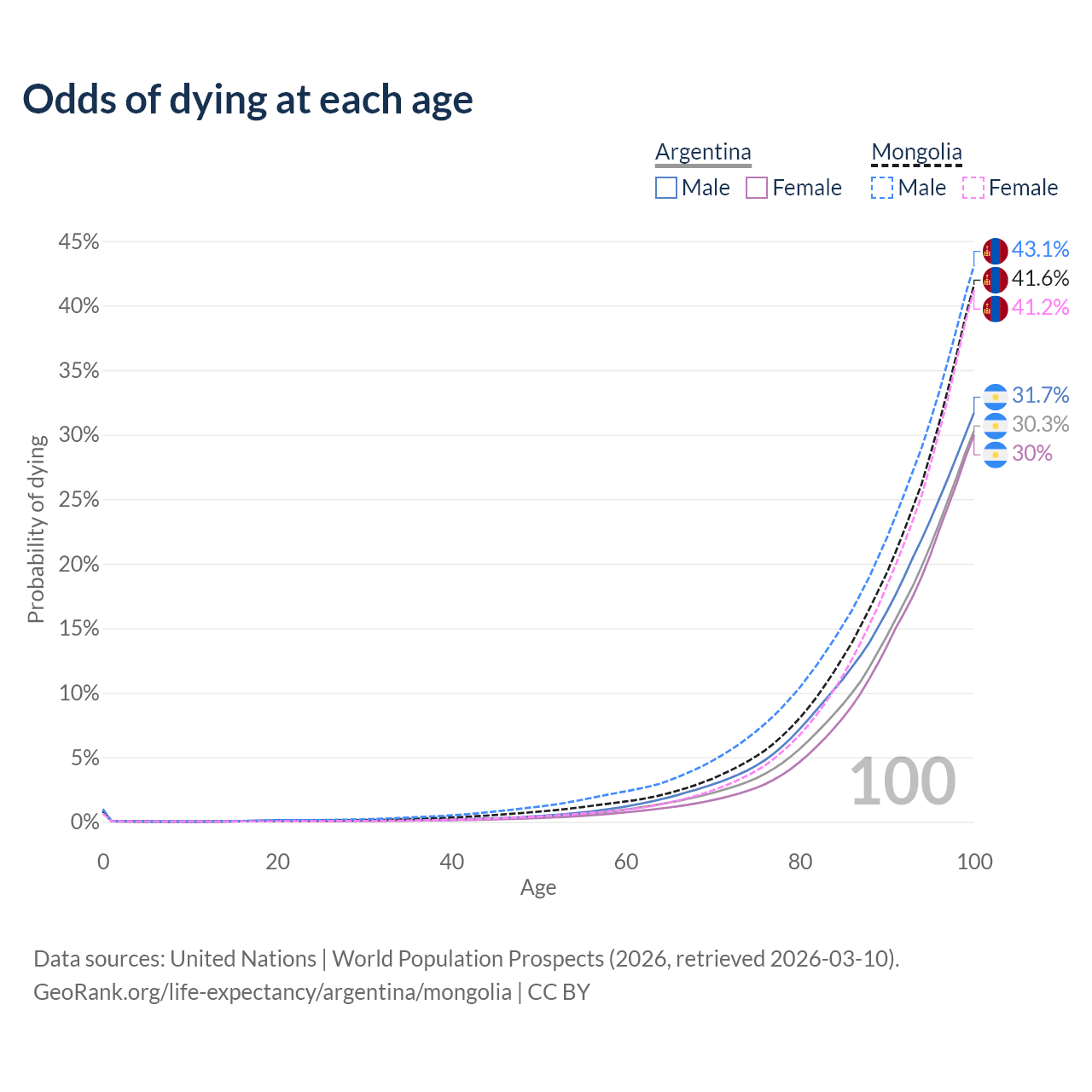 This life expectancy calculator shows the odds of living to 100, 95, 90, and below based on current age for both males and females in Argentina and Mongolia, along with mean and median age of death. The calculations are based on the 2026 life tables (actuarial tables) from the UN World Population Prospects.