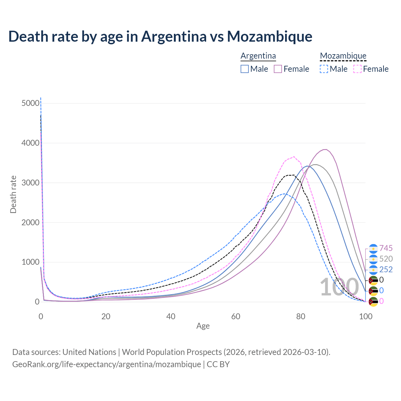 In Argentina, the most common age of death is 85, compared to 0 in Mozambique. The median age of death is 81.4 in Argentina and 71.2 in Mozambique, meaning only half of each cohort is expected to live past that age.