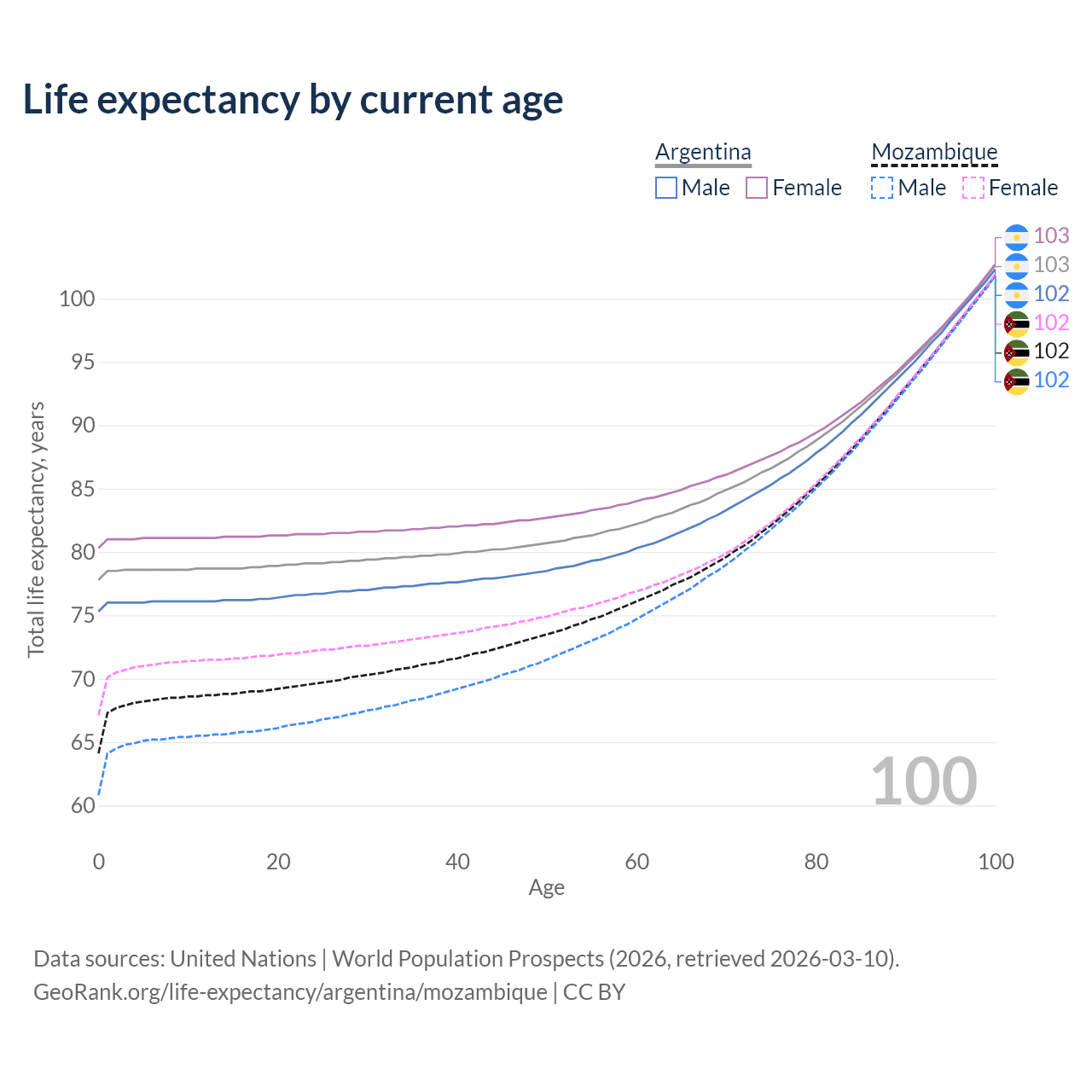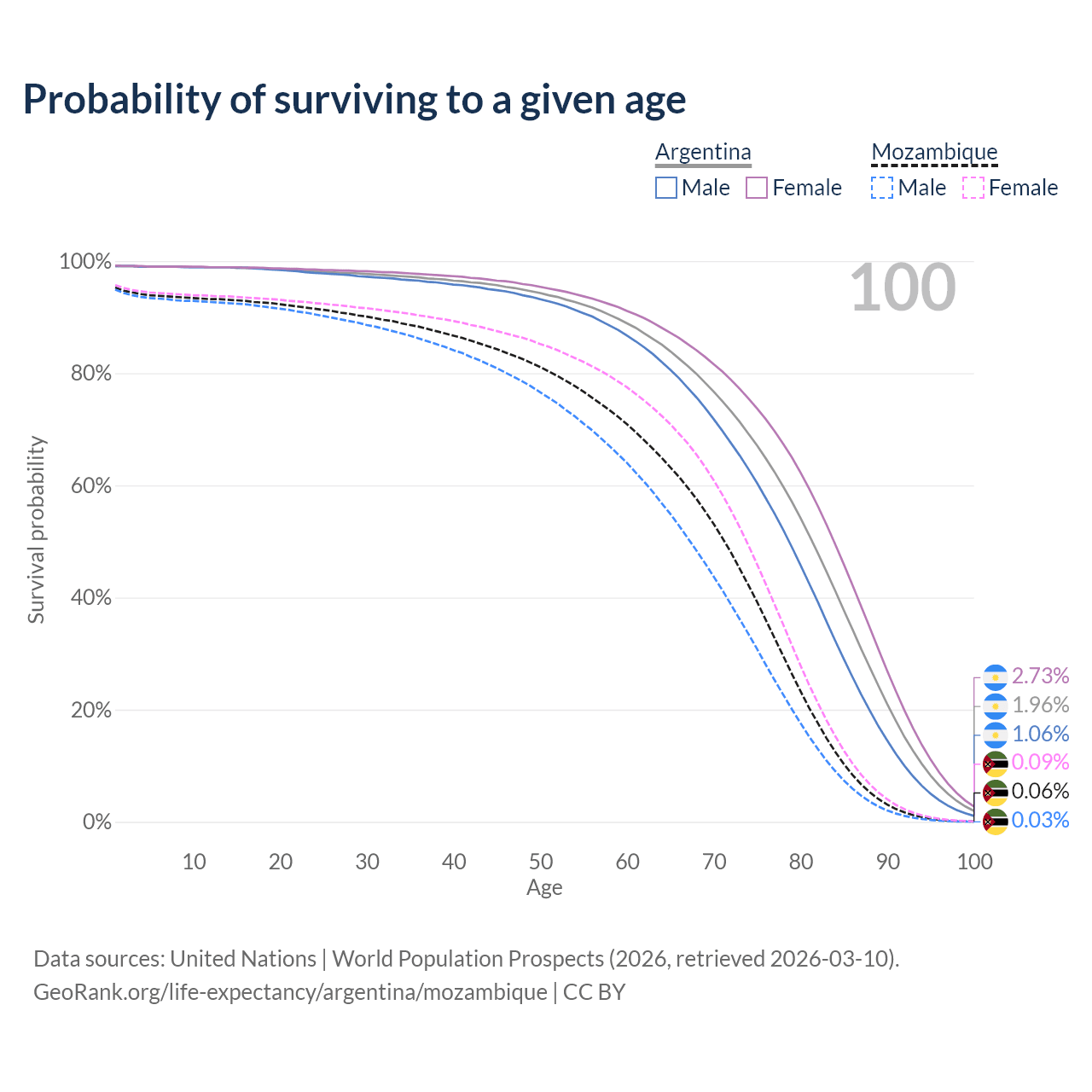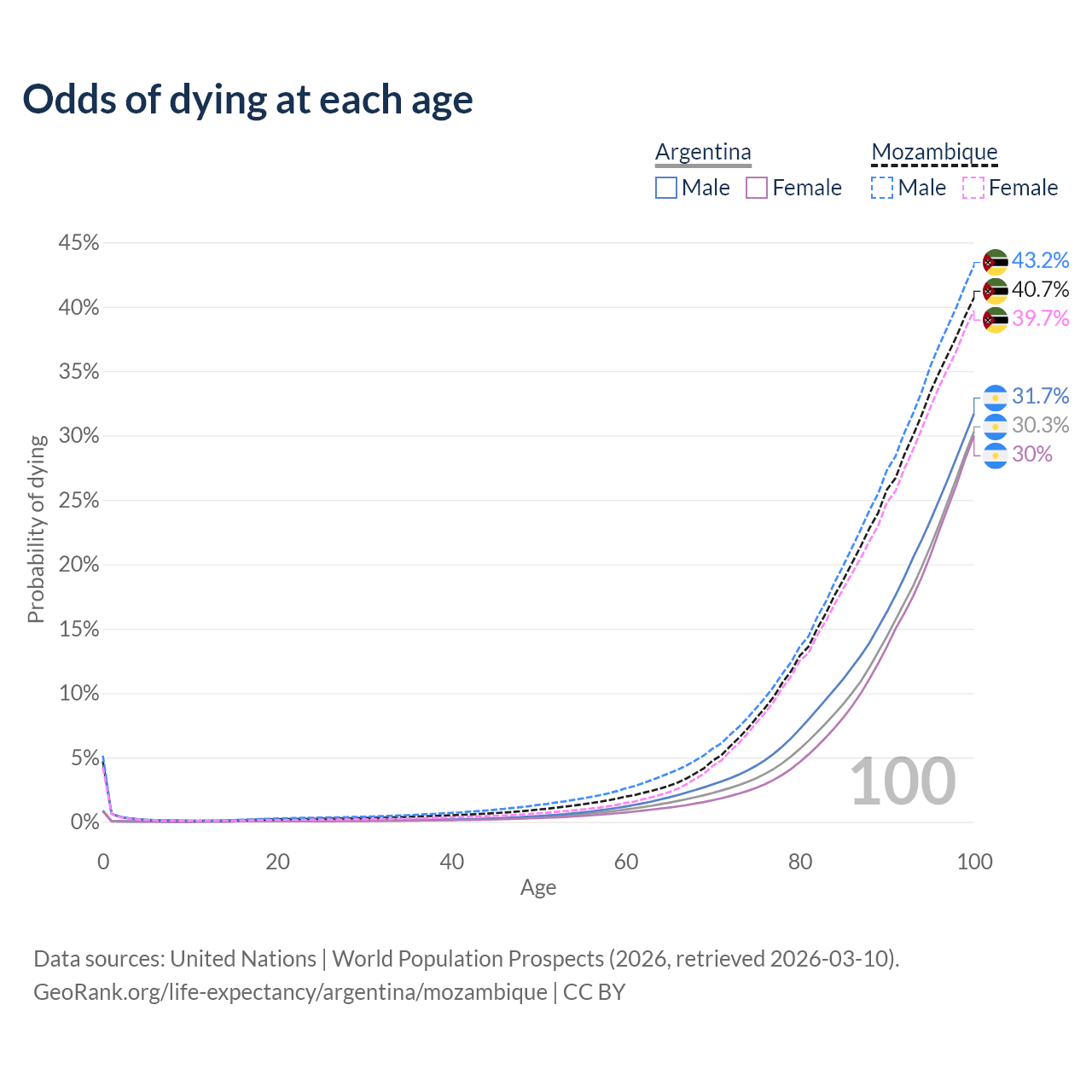 This life expectancy calculator shows the odds of living to 100, 95, 90, and below based on current age for both males and females in Argentina and Mozambique, along with mean and median age of death. The calculations are based on the 2026 life tables (actuarial tables) from the UN World Population Prospects.