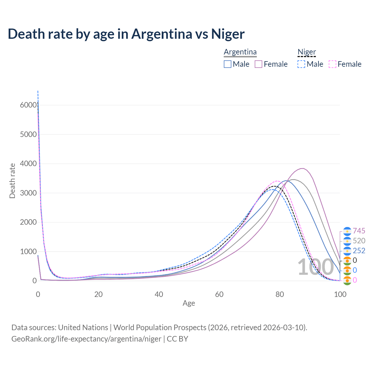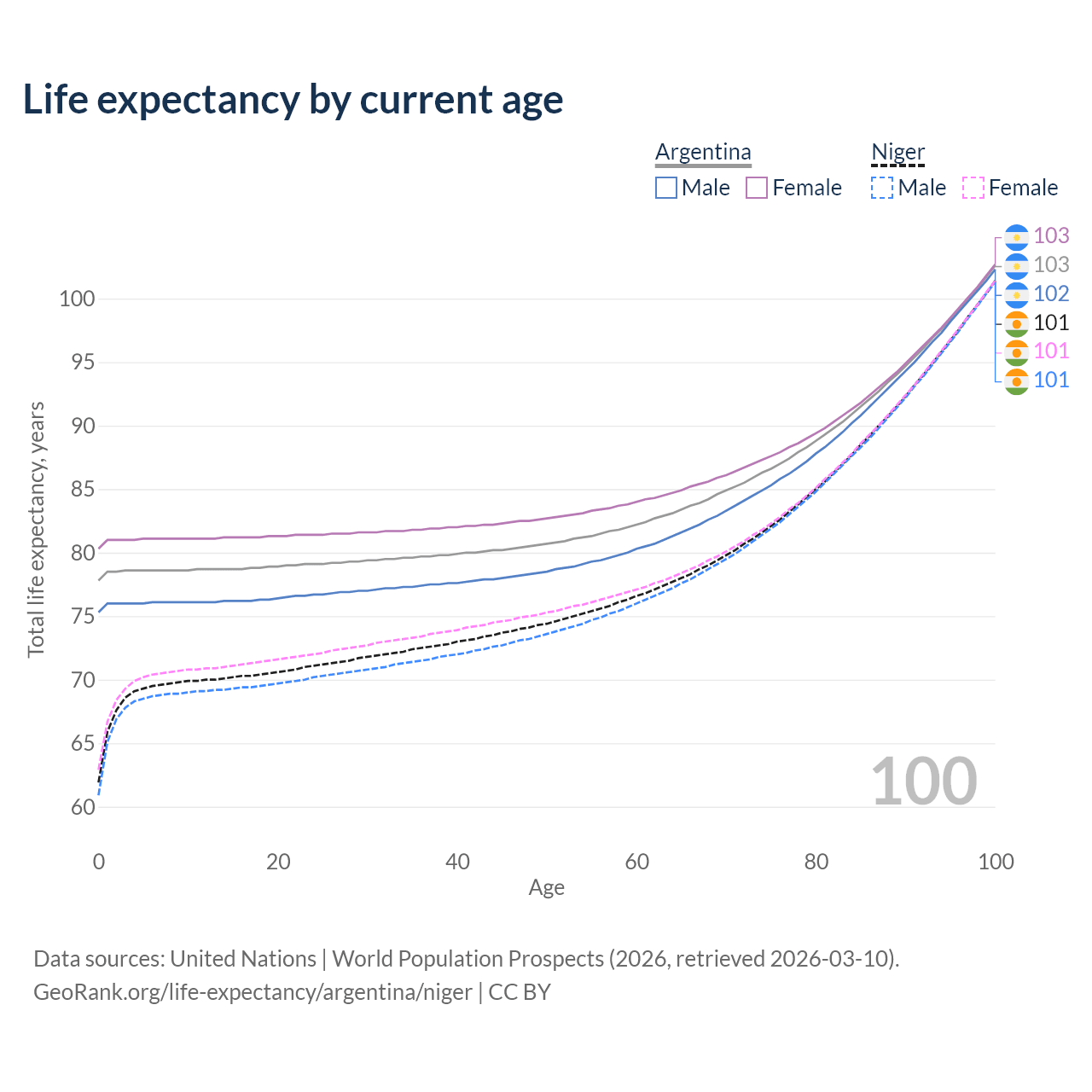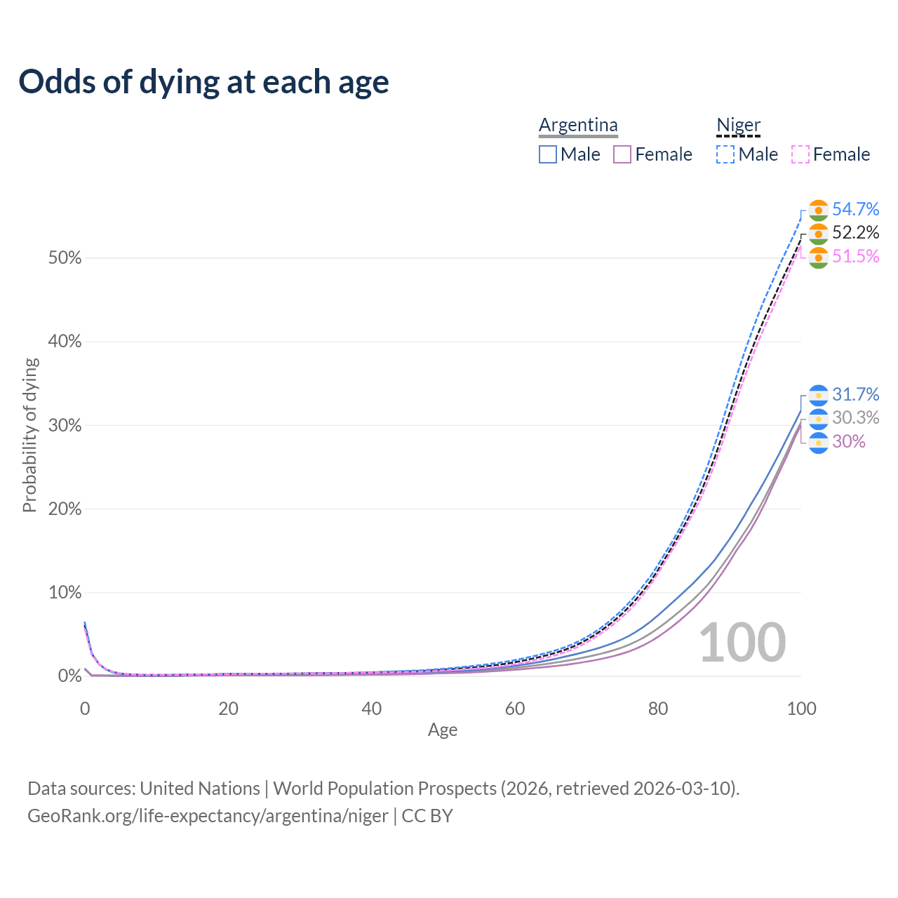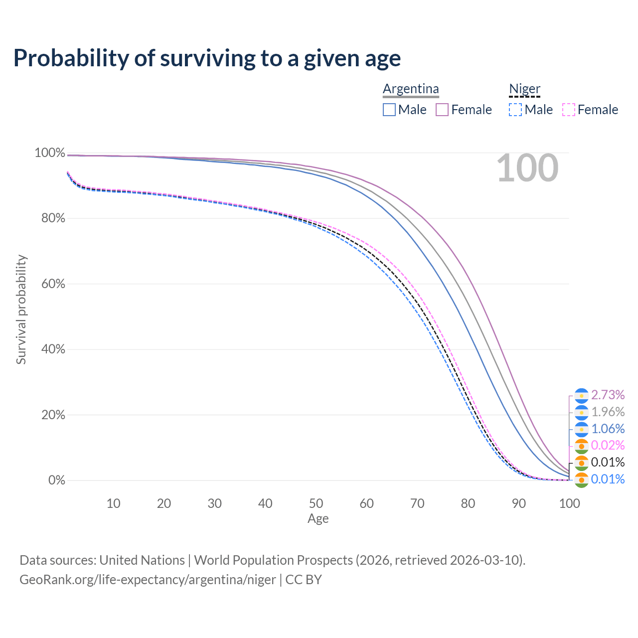 This life expectancy calculator shows the odds of living to 100, 95, 90, and below based on current age for both males and females in Argentina and Niger, along with mean and median age of death. The calculations are based on the 2026 life tables (actuarial tables) from the UN World Population Prospects.