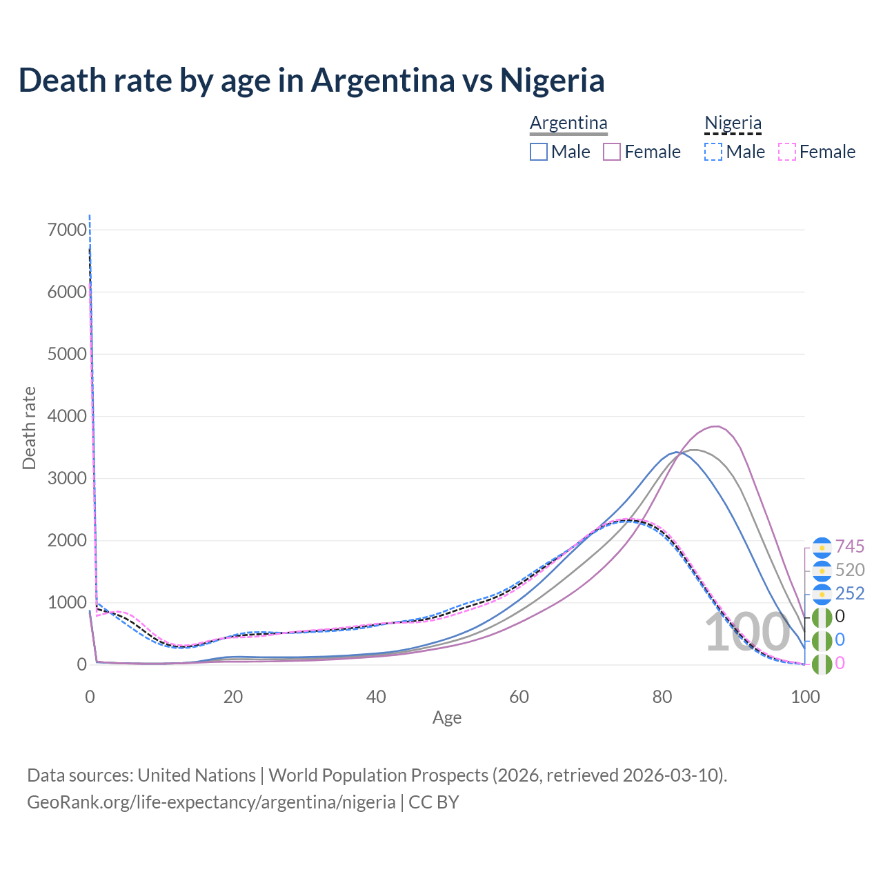 In Argentina, the most common age of death is 85, compared to 0 in Nigeria. The median age of death is 81.4 in Argentina and 64.3 in Nigeria, meaning only half of each cohort is expected to live past that age.