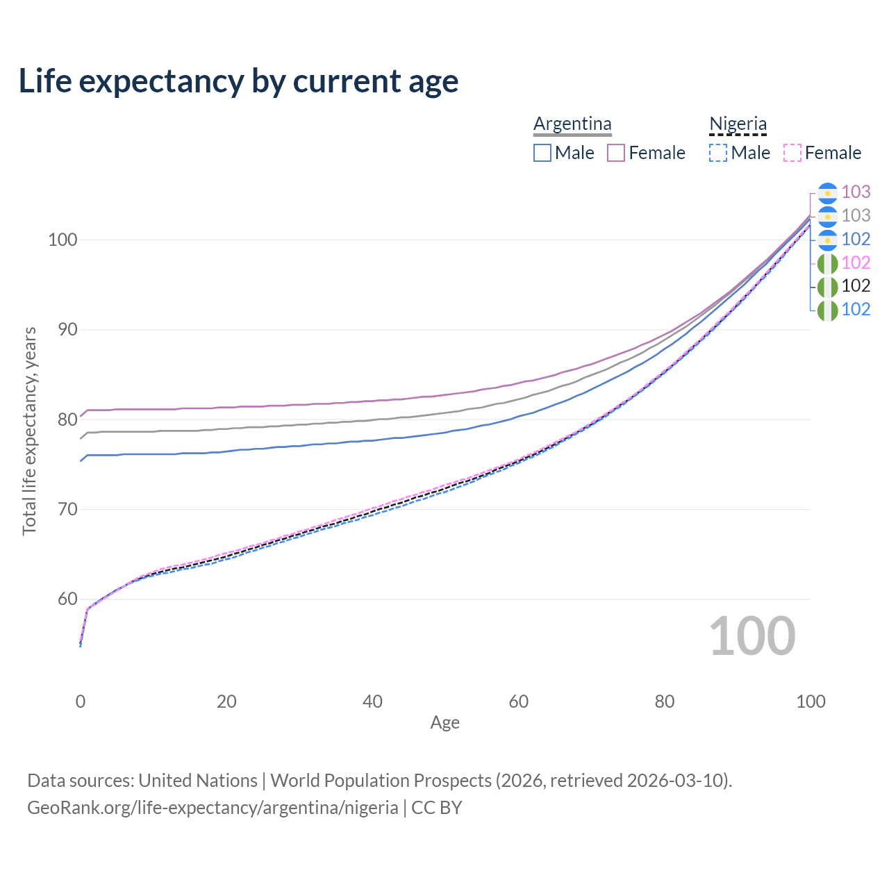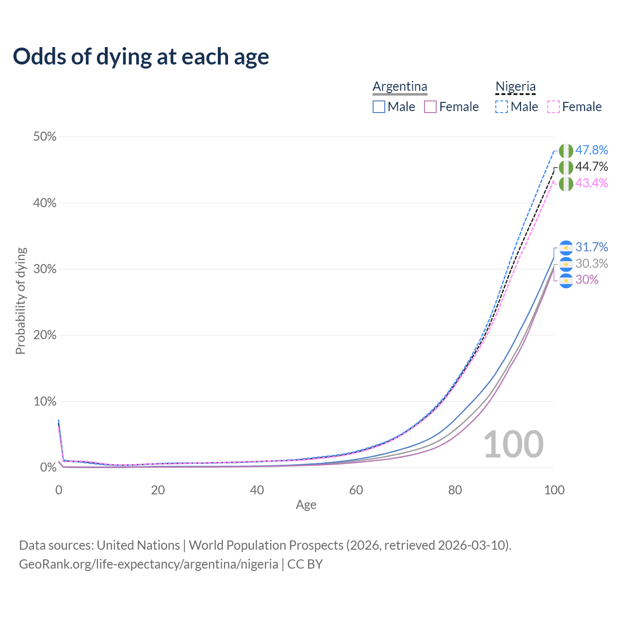 This life expectancy calculator shows the odds of living to 100, 95, 90, and below based on current age for both males and females in Argentina and Nigeria, along with mean and median age of death. The calculations are based on the 2026 life tables (actuarial tables) from the UN World Population Prospects.