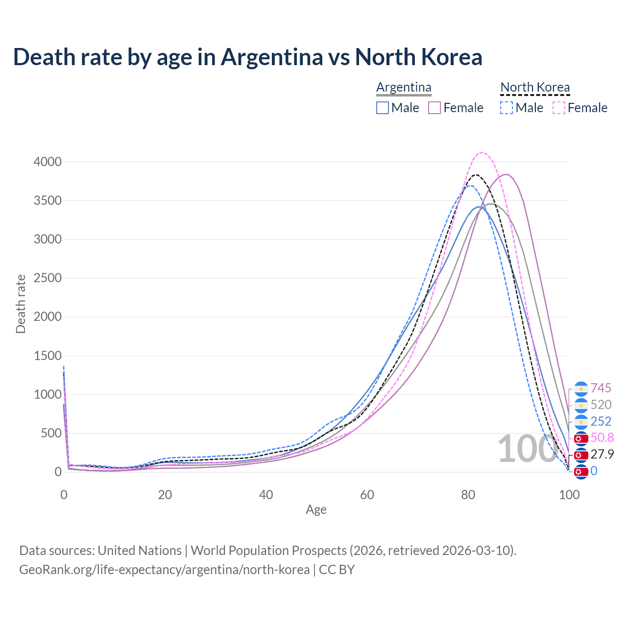 In Argentina, the most common age of death is 85, compared to 82 in North Korea. The median age of death is 81.4 in Argentina and 78.5 in North Korea, meaning only half of each cohort is expected to live past that age.