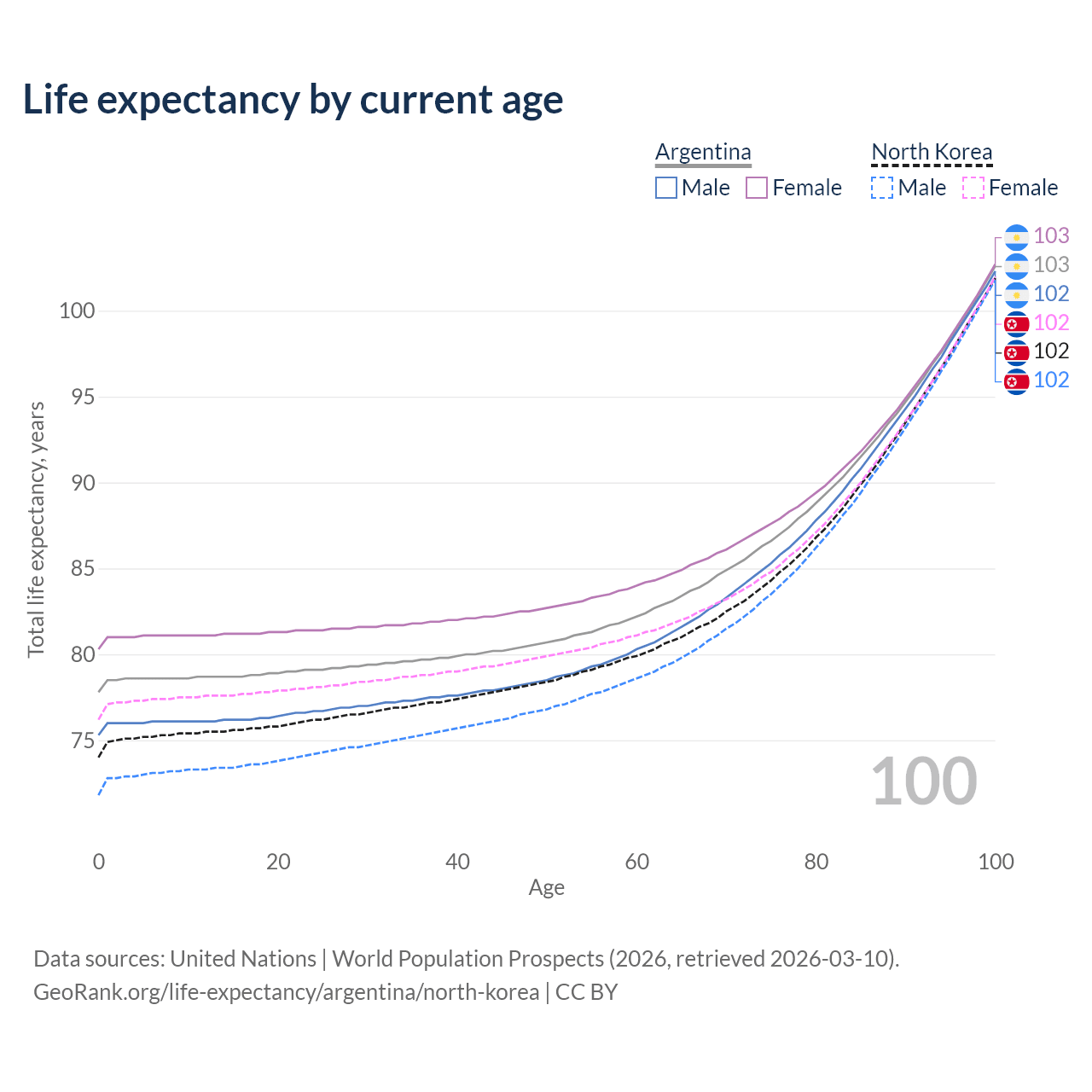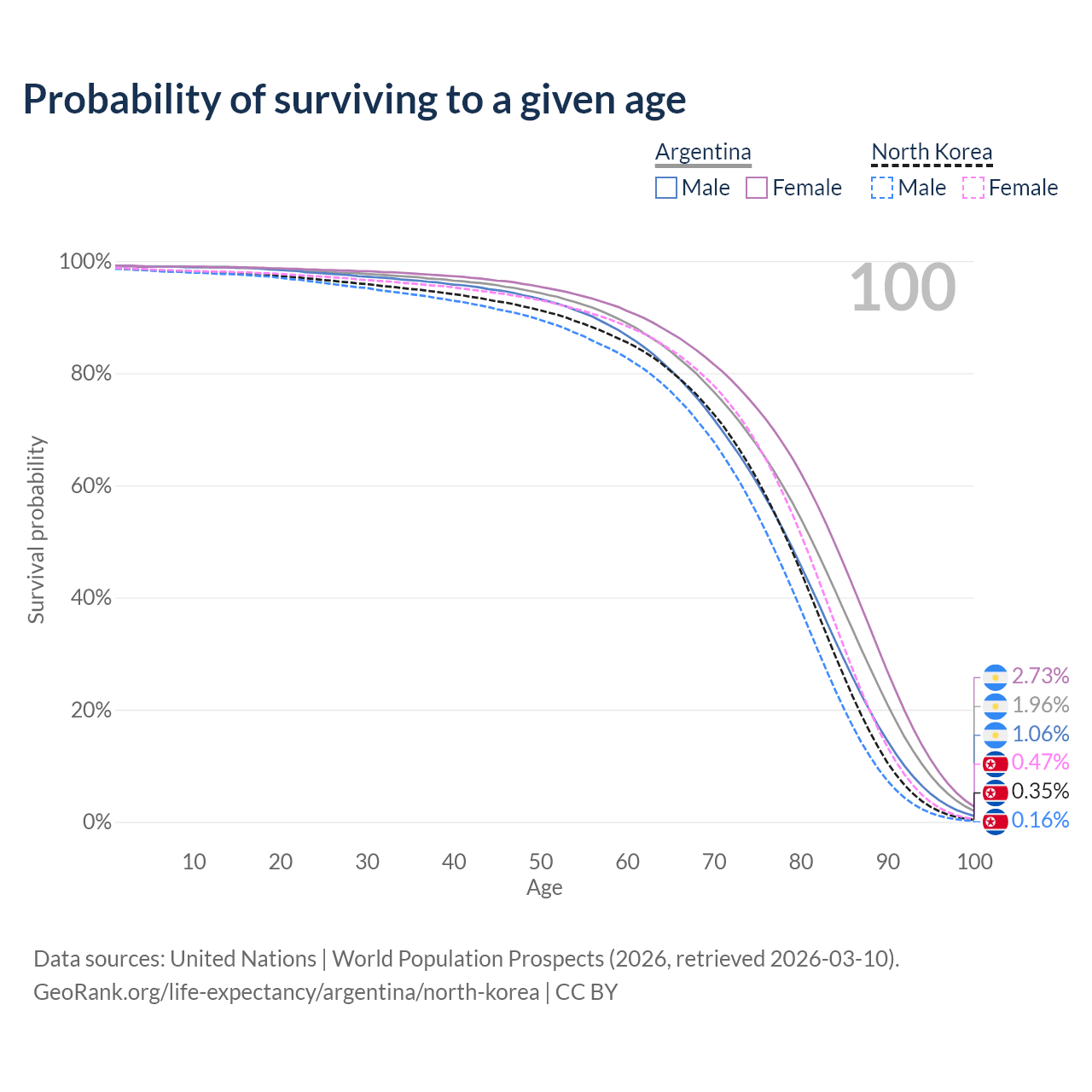 This life expectancy calculator shows the odds of living to 100, 95, 90, and below based on current age for both males and females in Argentina and North Korea, along with mean and median age of death. The calculations are based on the 2026 life tables (actuarial tables) from the UN World Population Prospects.