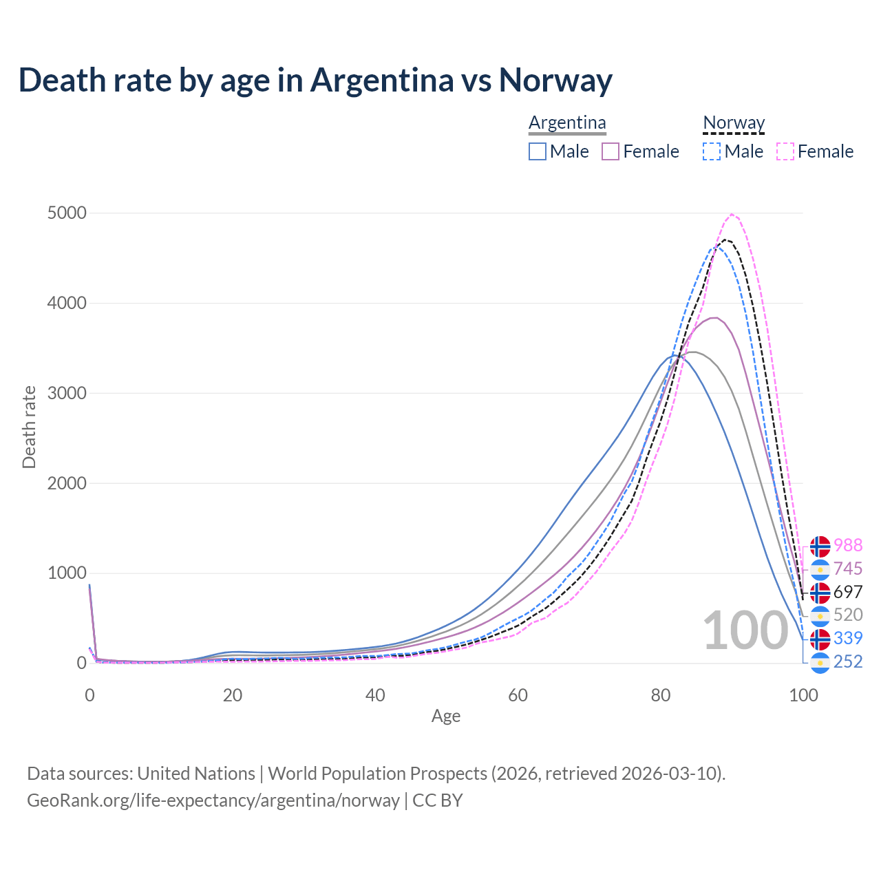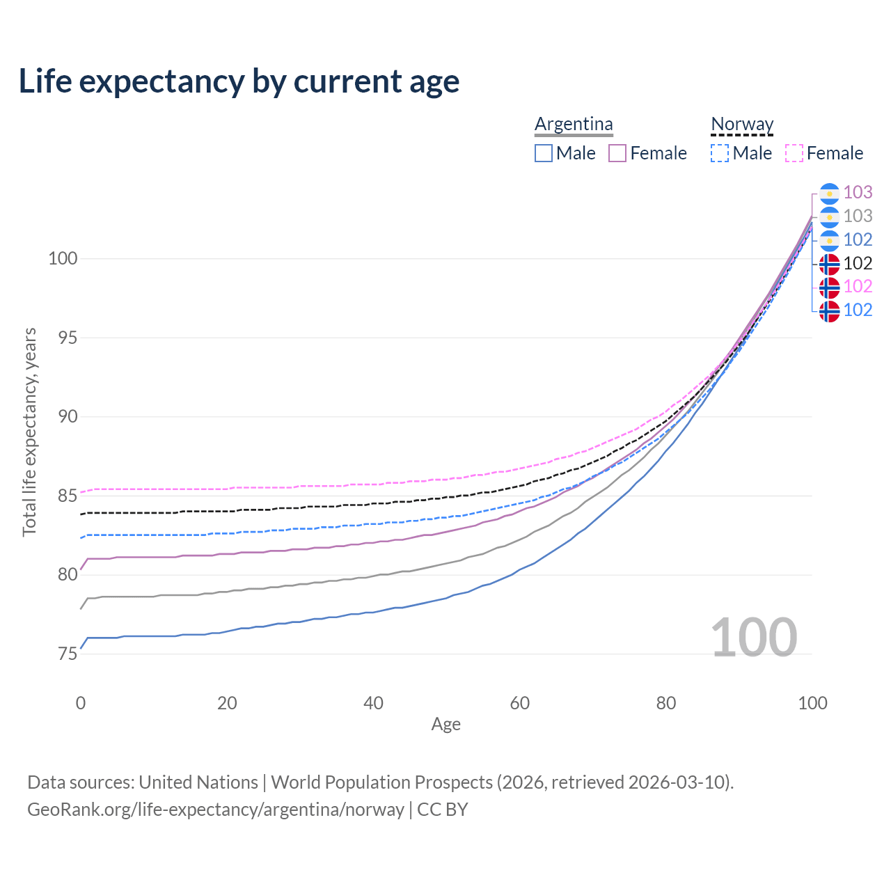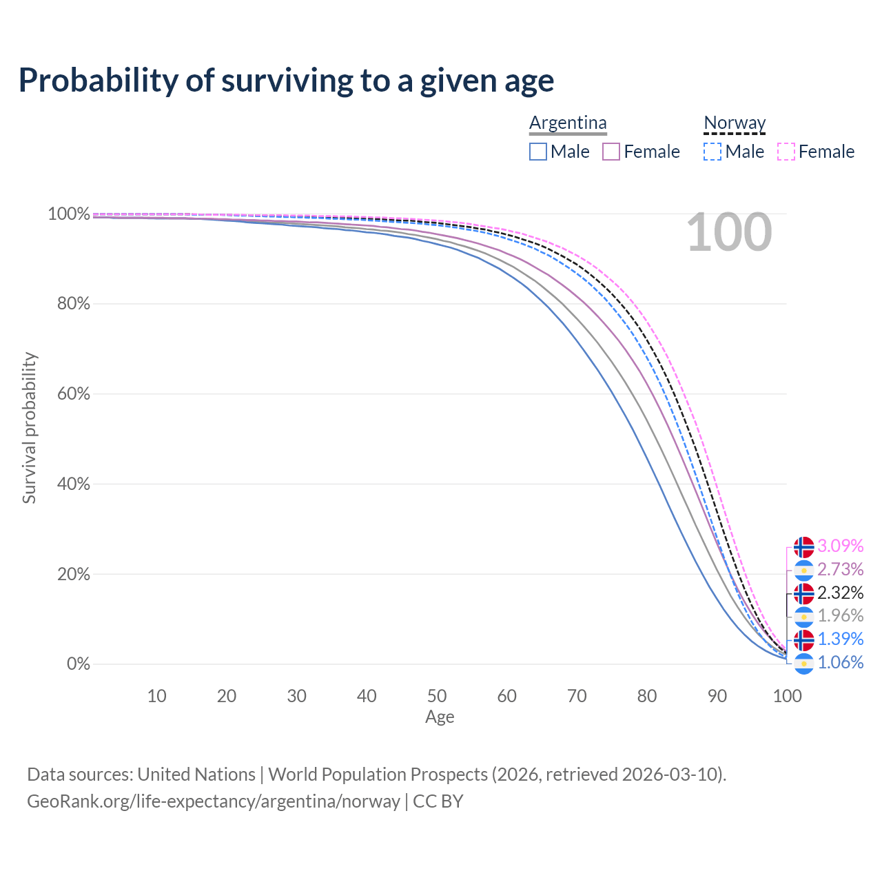 This life expectancy calculator shows the odds of living to 100, 95, 90, and below based on current age for both males and females in Argentina and Norway, along with mean and median age of death. The calculations are based on the 2026 life tables (actuarial tables) from the UN World Population Prospects.
