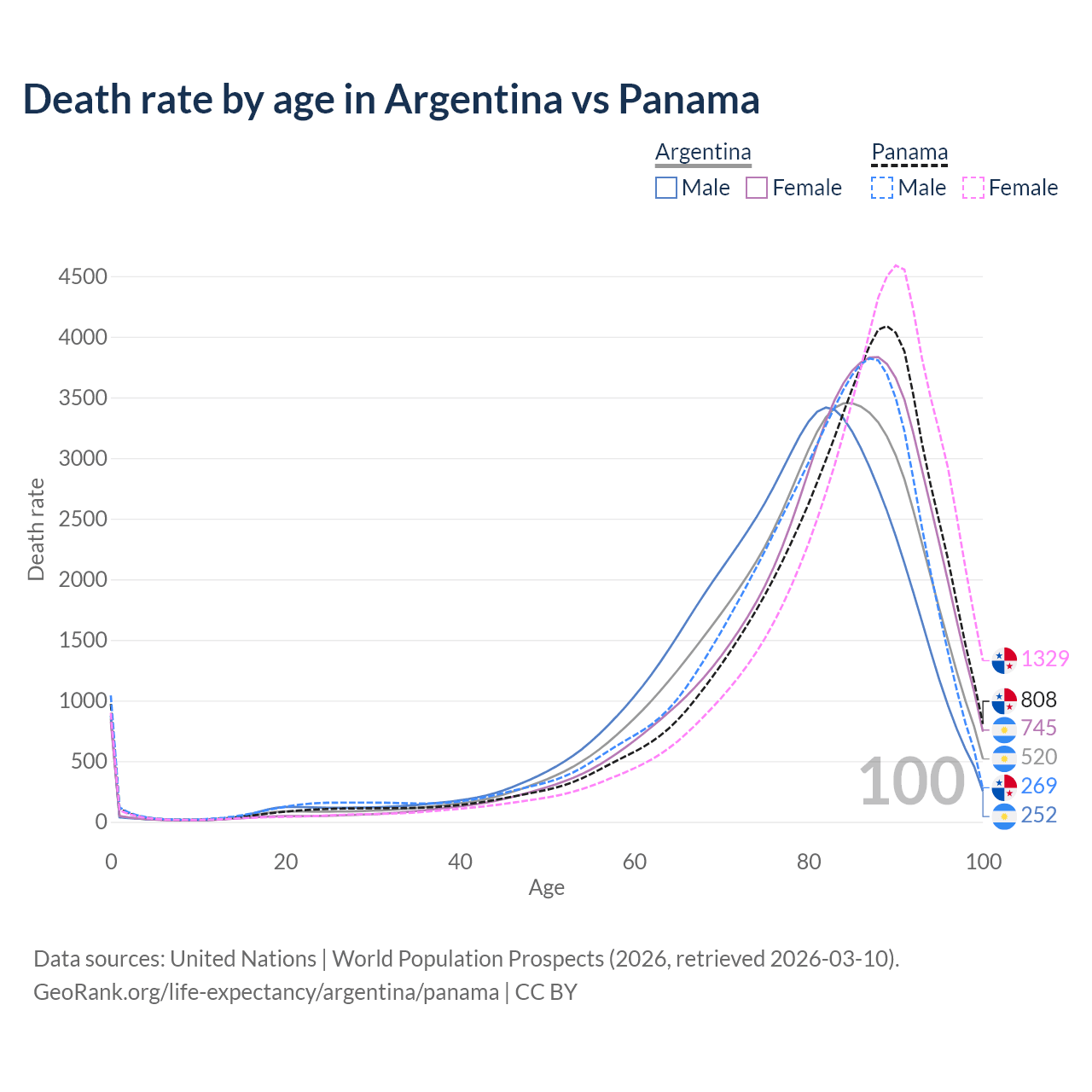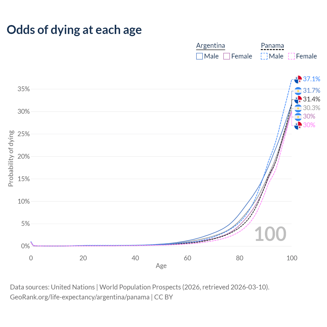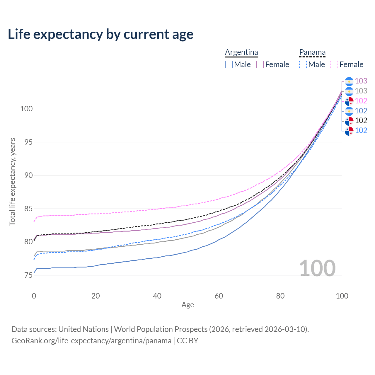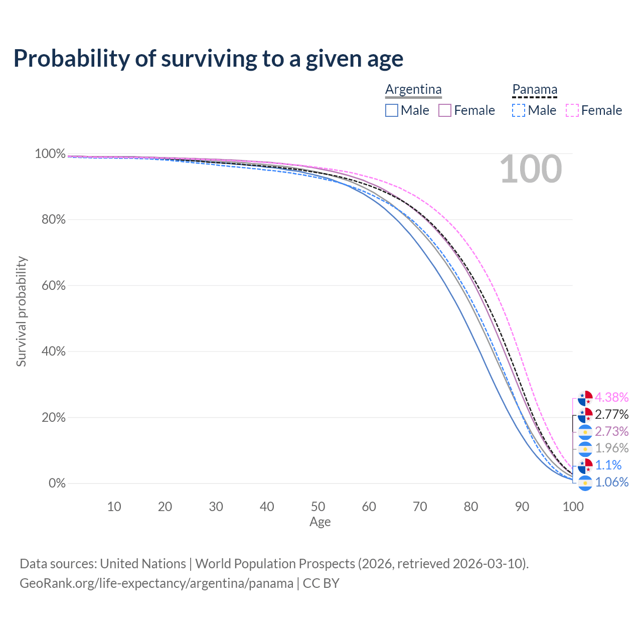 This life expectancy calculator shows the odds of living to 100, 95, 90, and below based on current age for both males and females in Argentina and Panama, along with mean and median age of death. The calculations are based on the 2026 life tables (actuarial tables) from the UN World Population Prospects.
