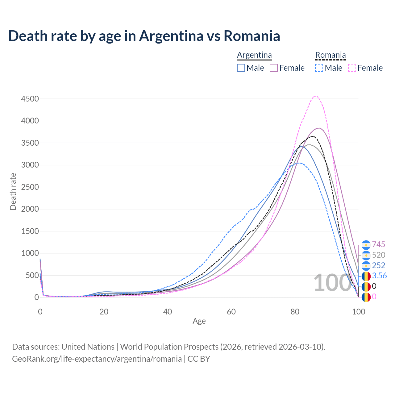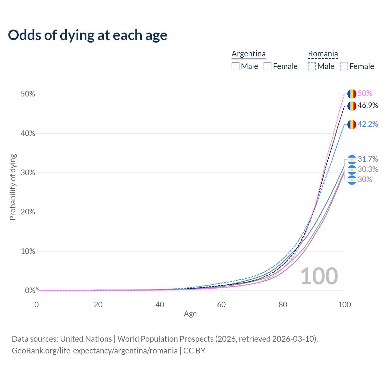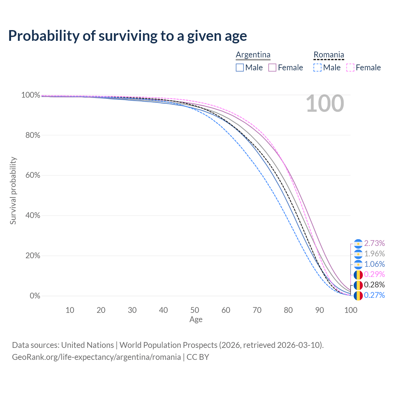 This life expectancy calculator shows the odds of living to 100, 95, 90, and below based on current age for both males and females in Argentina and Romania, along with mean and median age of death. The calculations are based on the 2026 life tables (actuarial tables) from the UN World Population Prospects.
