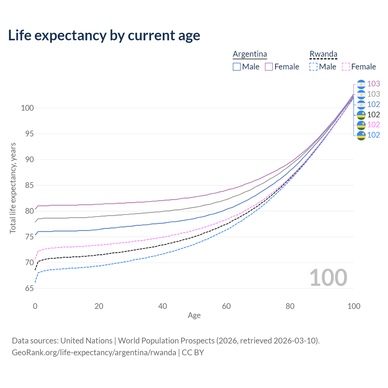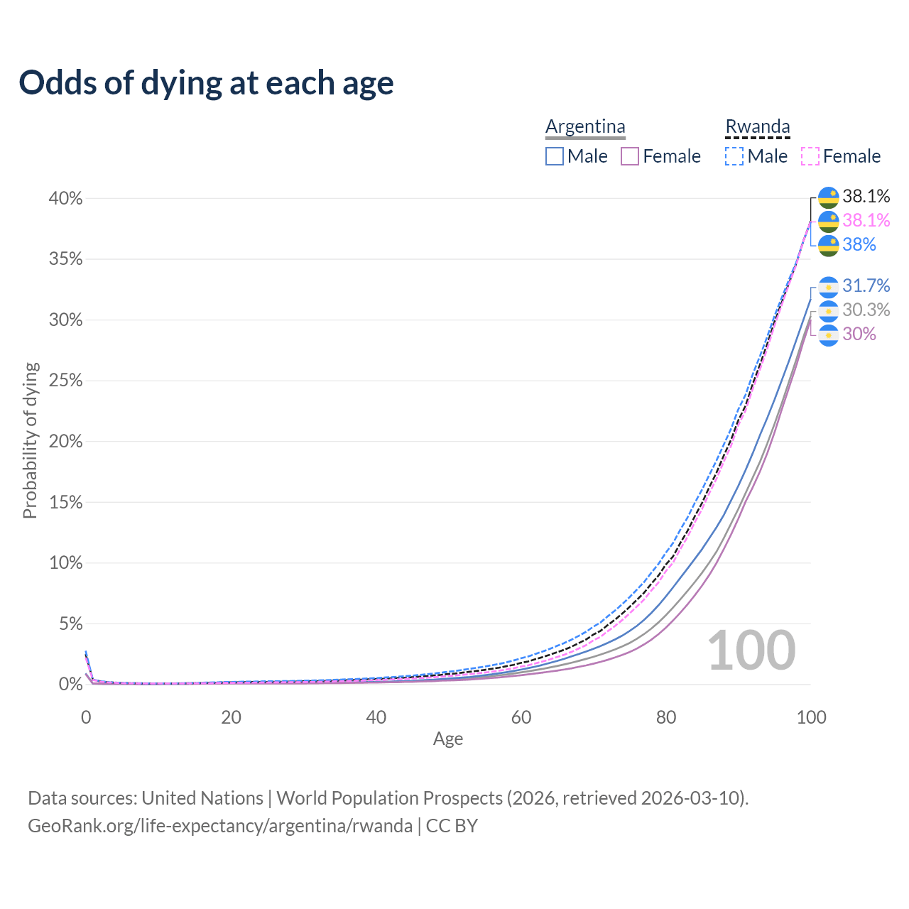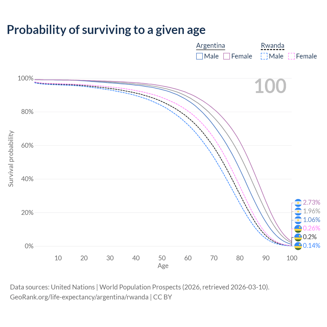 This life expectancy calculator shows the odds of living to 100, 95, 90, and below based on current age for both males and females in Argentina and Rwanda, along with mean and median age of death. The calculations are based on the 2026 life tables (actuarial tables) from the UN World Population Prospects.