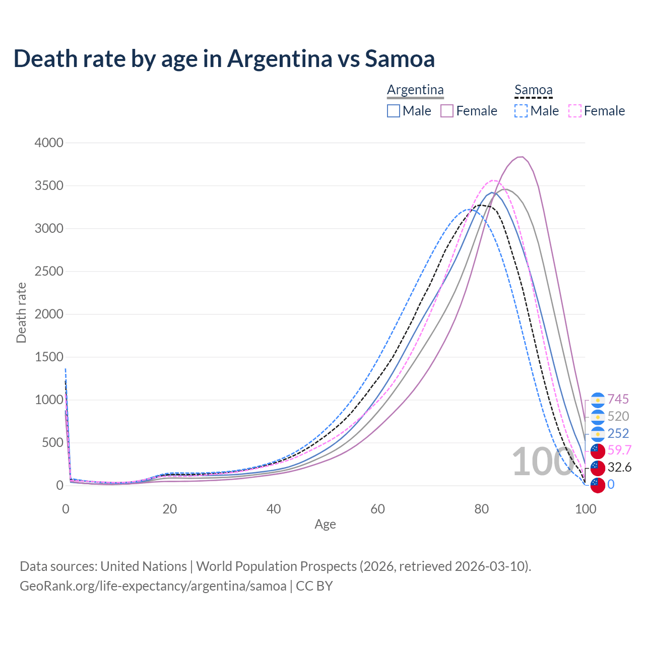 In Argentina, the most common age of death is 85, compared to 80 in Samoa. The median age of death is 81.4 in Argentina and 75.9 in Samoa, meaning only half of each cohort is expected to live past that age.