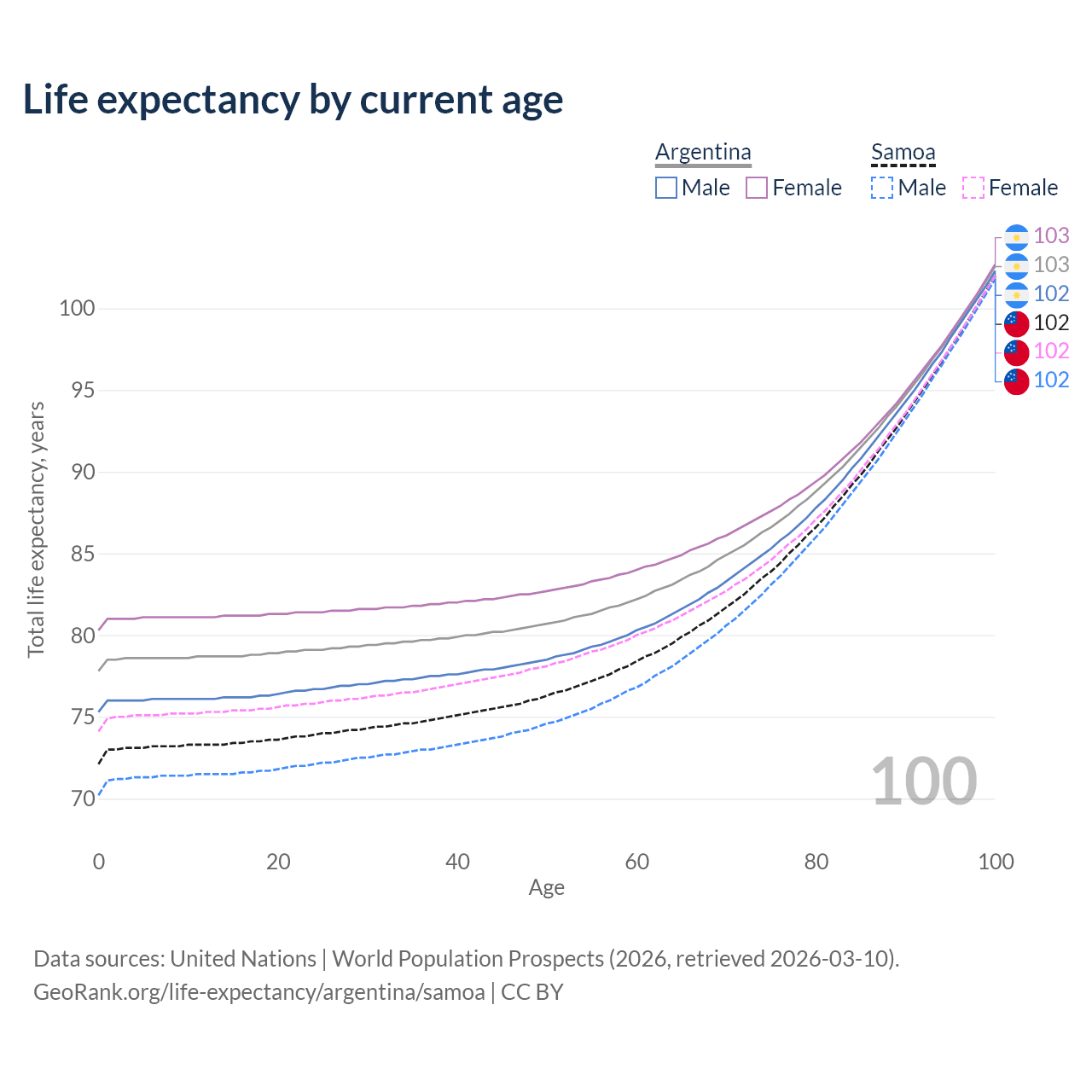 This life expectancy calculator shows the odds of living to 100, 95, 90, and below based on current age for both males and females in Argentina and Samoa, along with mean and median age of death. The calculations are based on the 2026 life tables (actuarial tables) from the UN World Population Prospects.