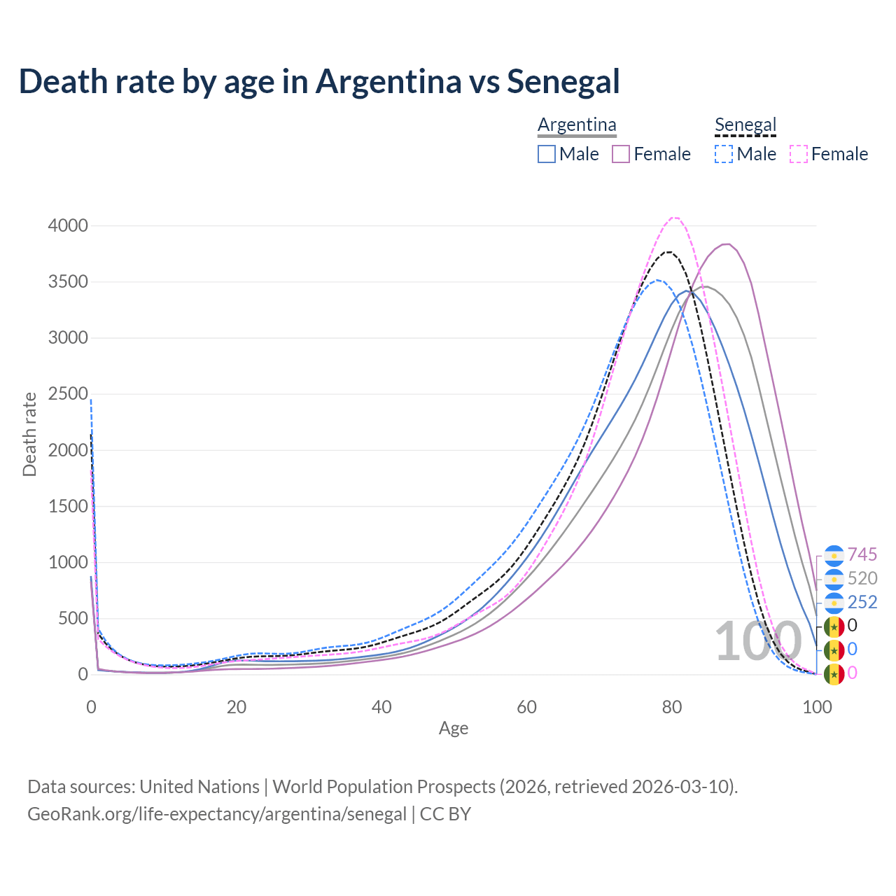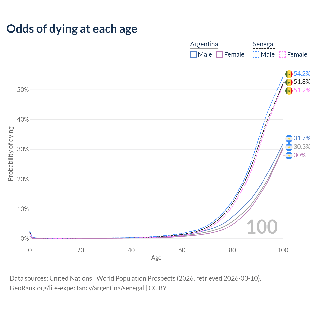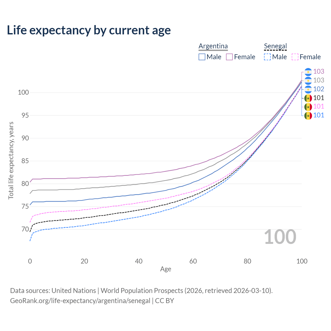 This life expectancy calculator shows the odds of living to 100, 95, 90, and below based on current age for both males and females in Argentina and Senegal, along with mean and median age of death. The calculations are based on the 2026 life tables (actuarial tables) from the UN World Population Prospects.