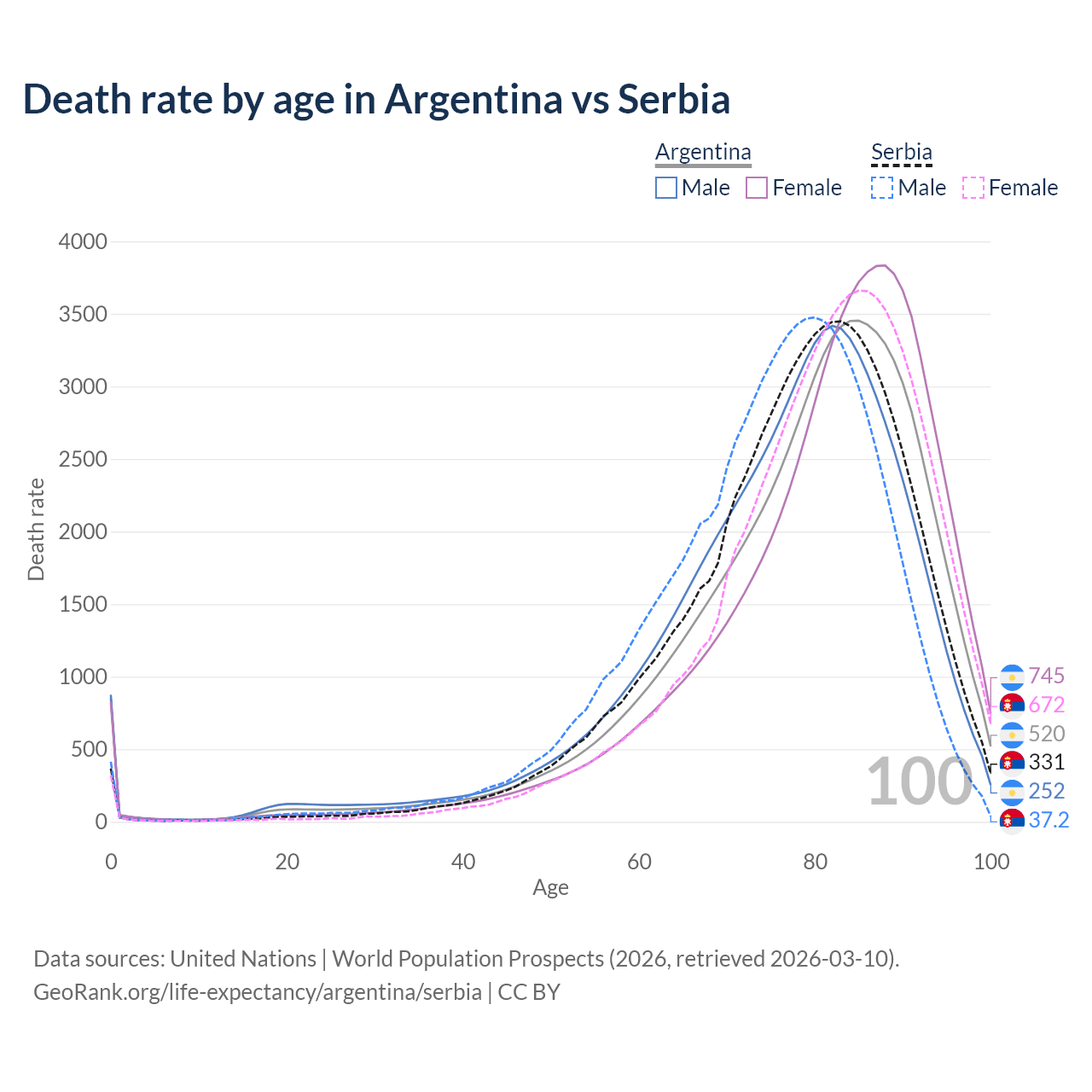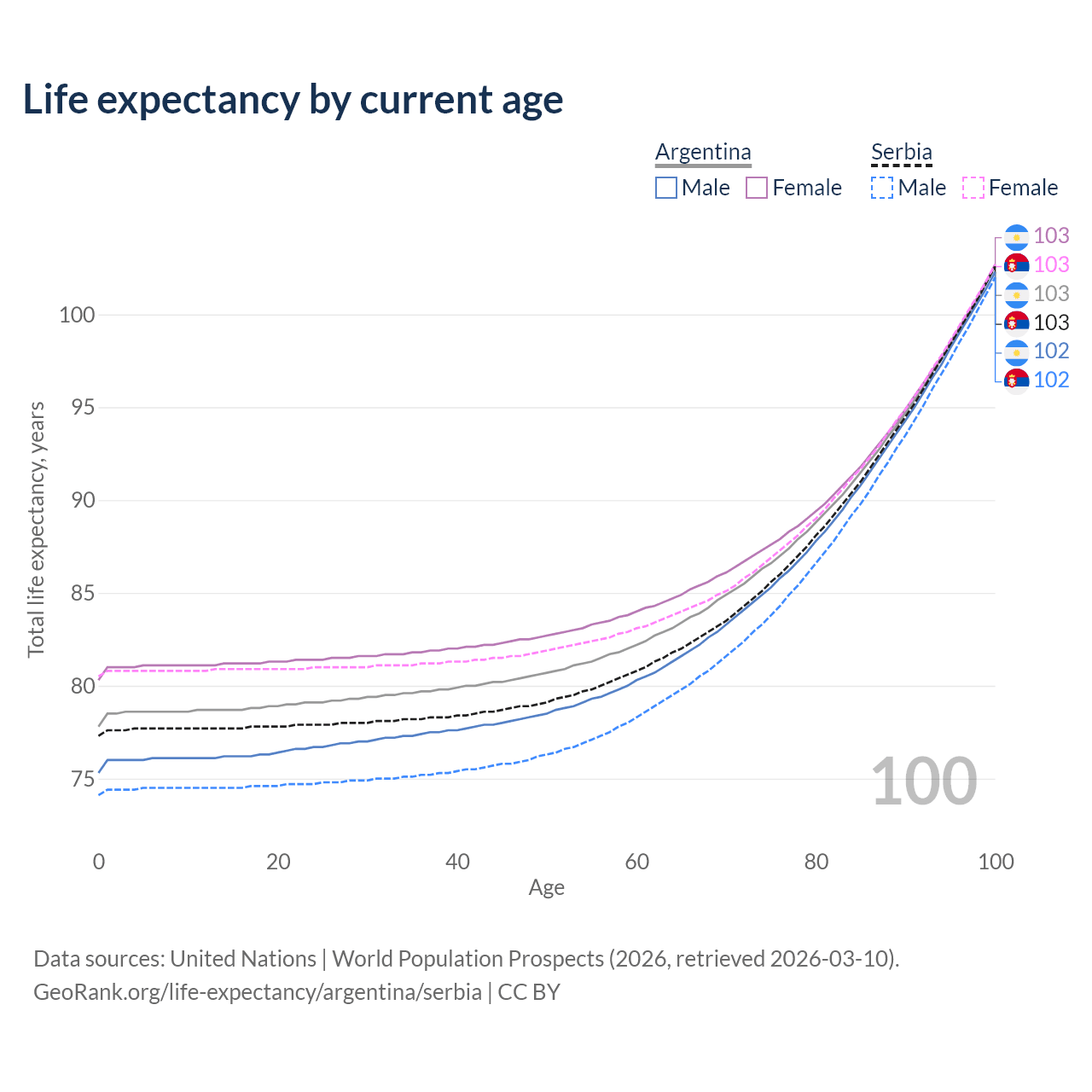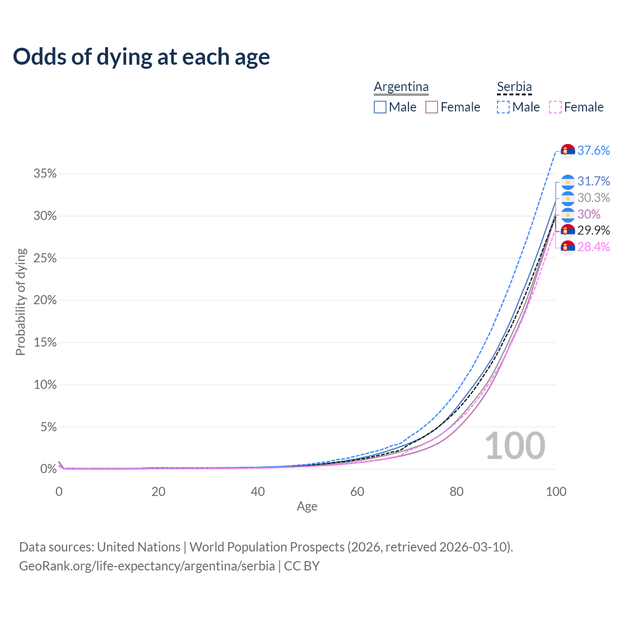 This life expectancy calculator shows the odds of living to 100, 95, 90, and below based on current age for both males and females in Argentina and Serbia, along with mean and median age of death. The calculations are based on the 2026 life tables (actuarial tables) from the UN World Population Prospects.