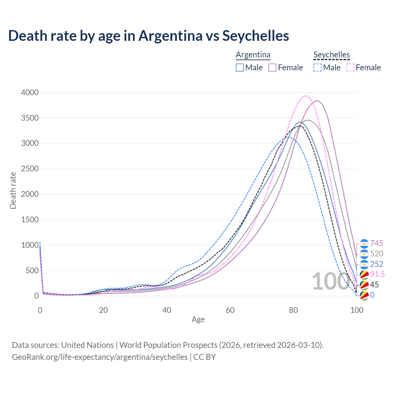 In Argentina, the most common age of death is 85, compared to 82 in the Seychelles. The median age of death is 81.4 in Argentina and 77 in the Seychelles, meaning only half of each cohort is expected to live past that age.