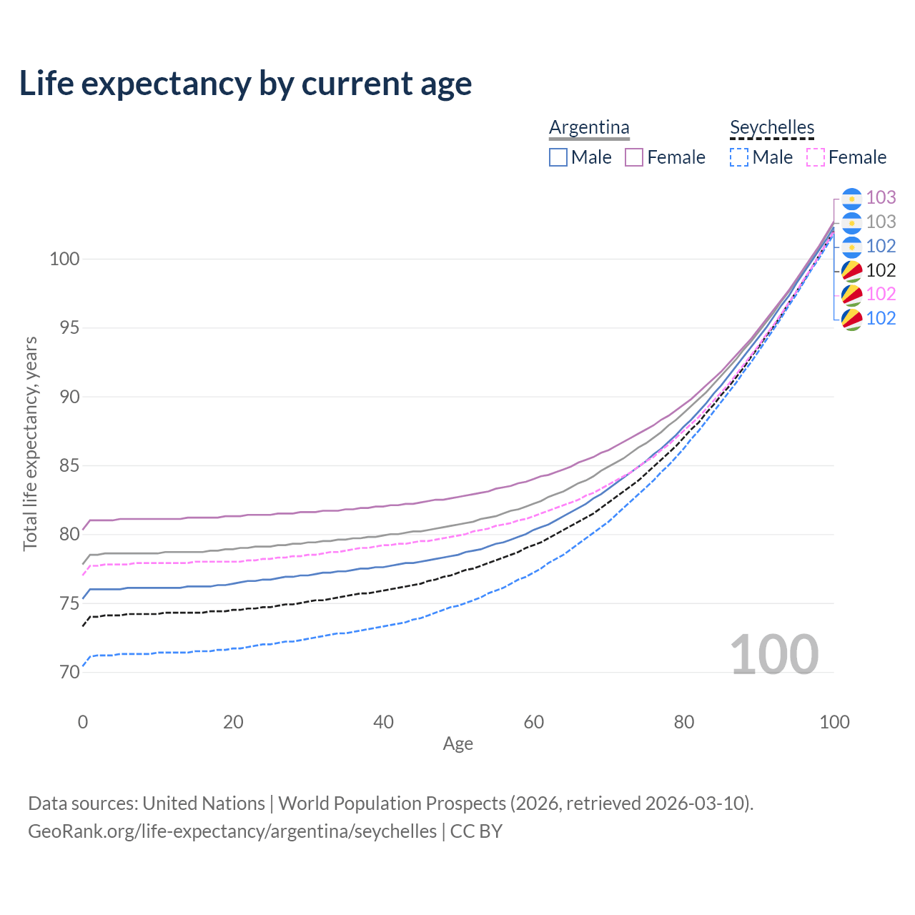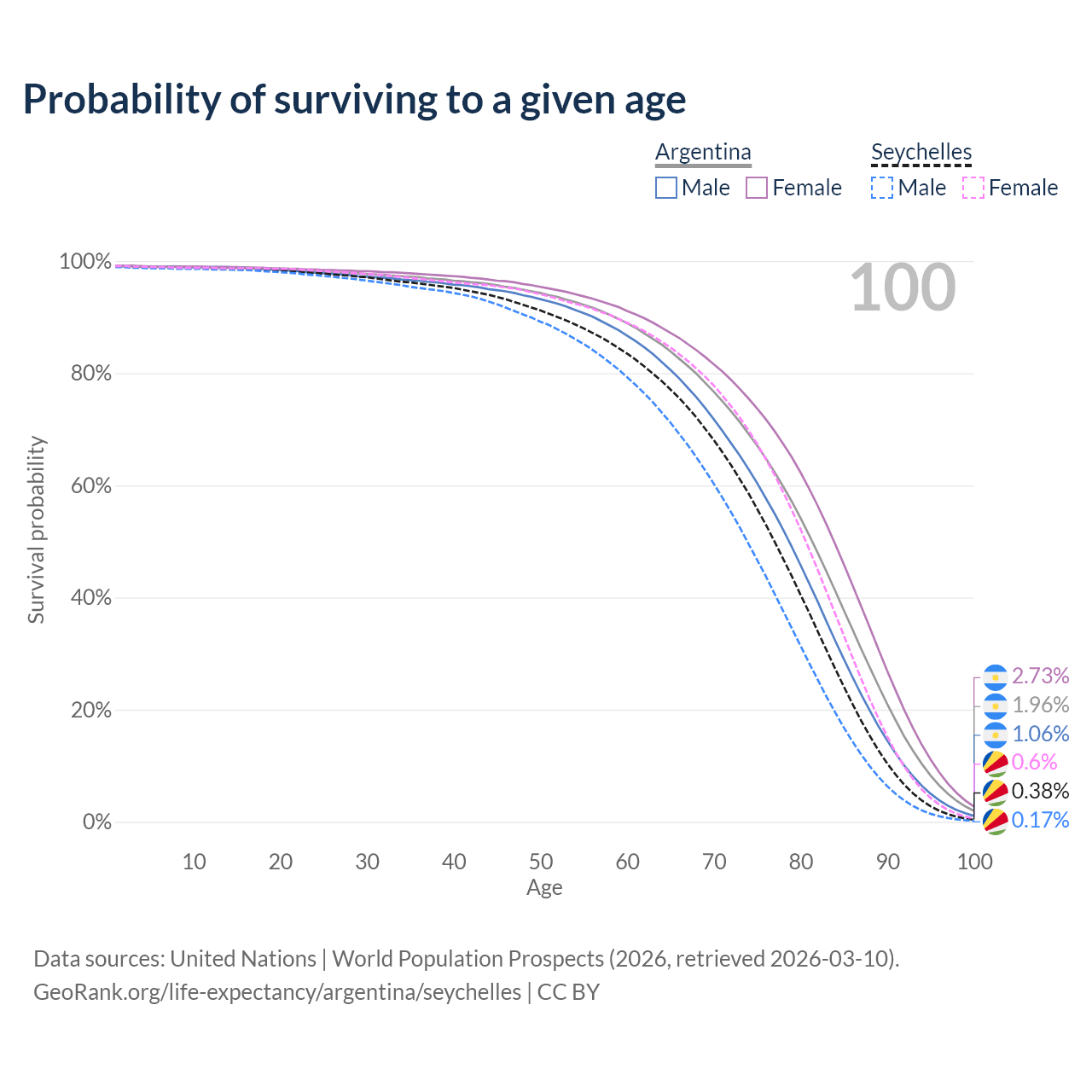This life expectancy calculator shows the odds of living to 100, 95, 90, and below based on current age for both males and females in Argentina and the Seychelles, along with mean and median age of death. The calculations are based on the 2026 life tables (actuarial tables) from the UN World Population Prospects.