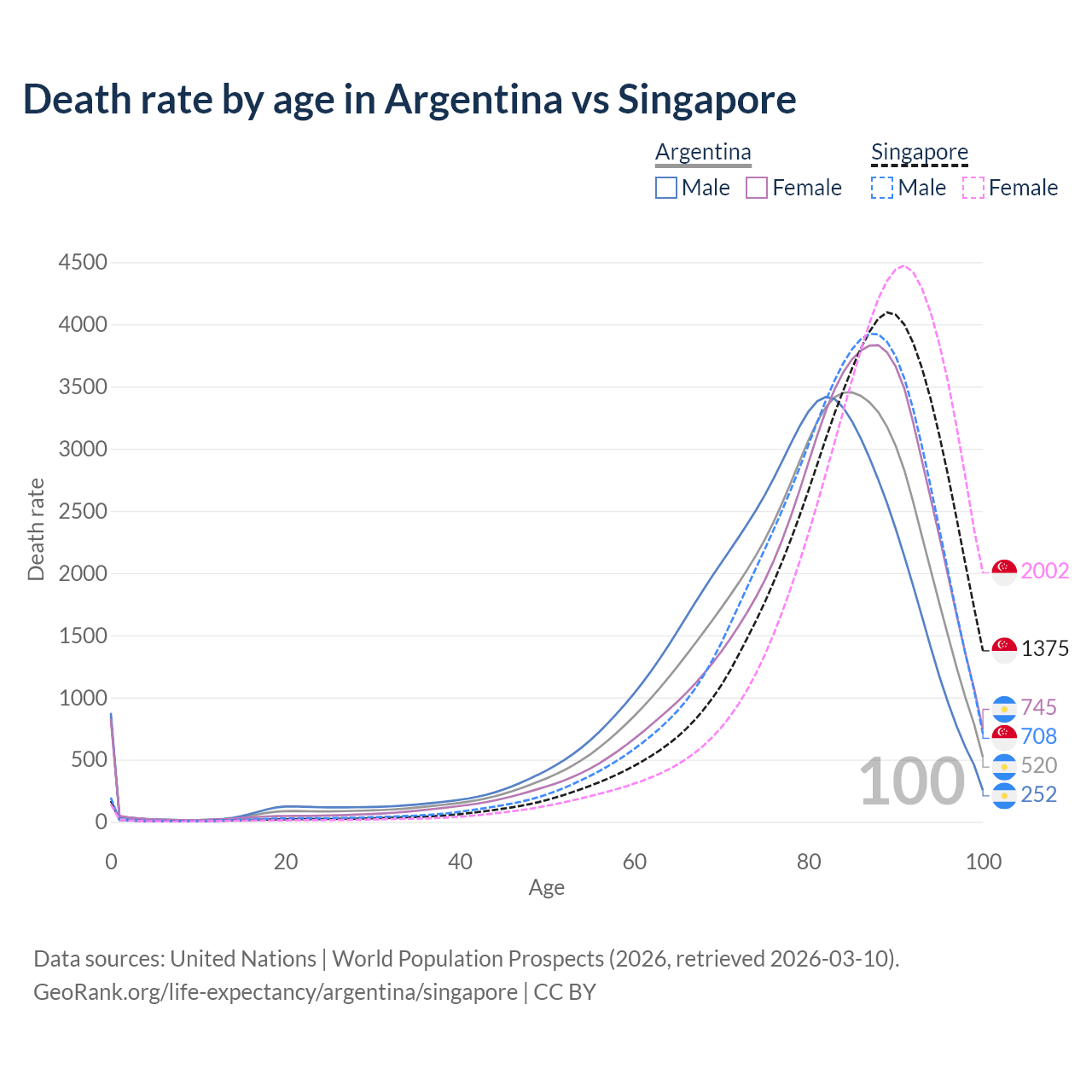 This life expectancy calculator shows the odds of living to 100, 95, 90, and below based on current age for both males and females in Argentina and Singapore, along with mean and median age of death. The calculations are based on the 2026 life tables (actuarial tables) from the UN World Population Prospects.