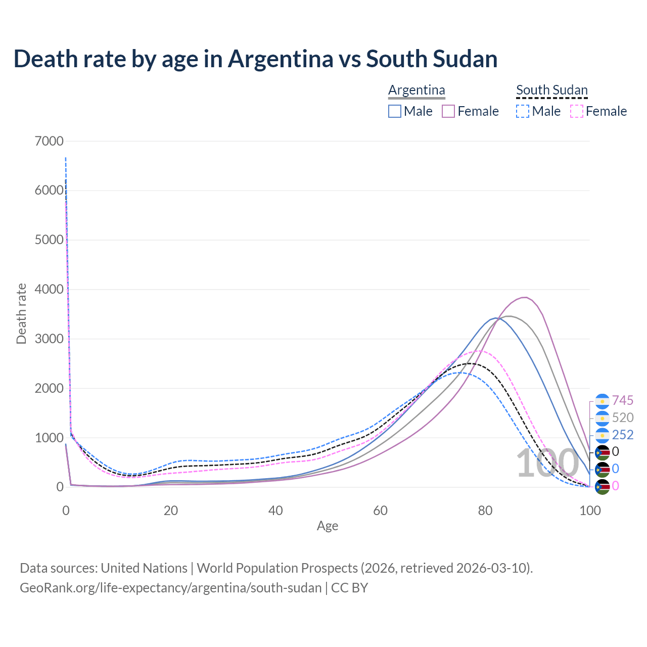 In Argentina, the most common age of death is 85, compared to 0 in South Sudan. The median age of death is 81.4 in Argentina and 67.5 in South Sudan, meaning only half of each cohort is expected to live past that age.