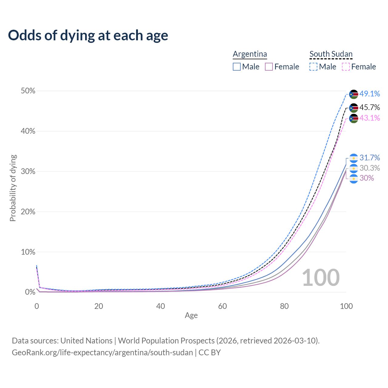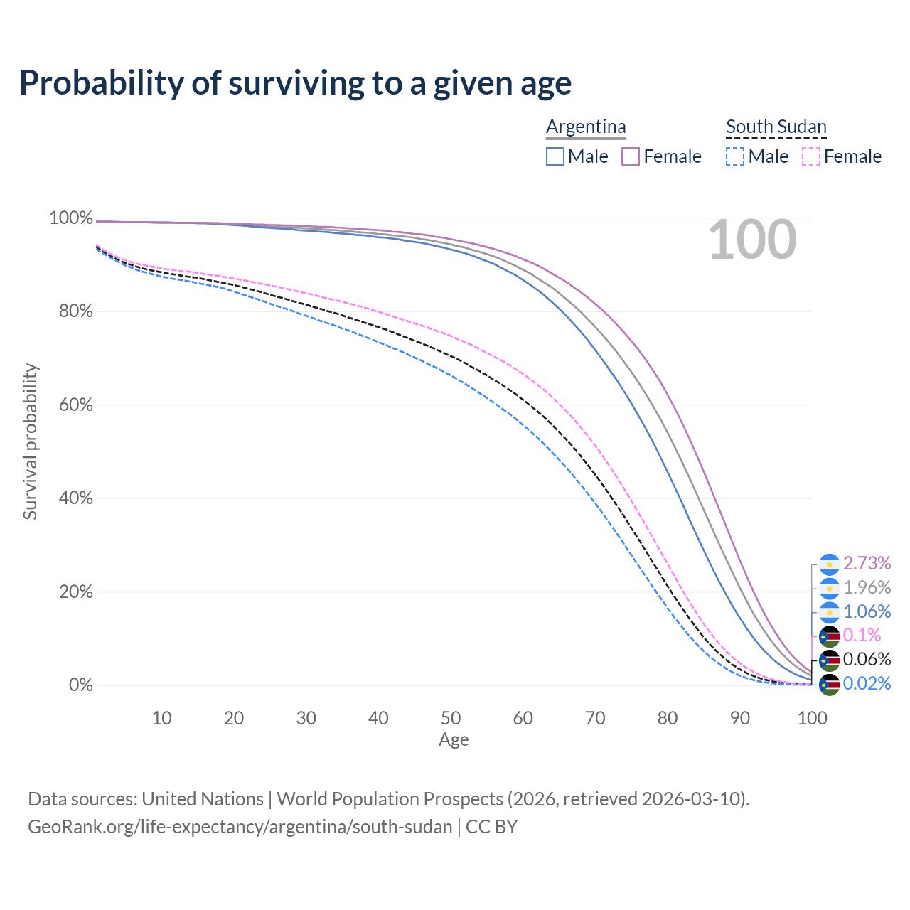 This life expectancy calculator shows the odds of living to 100, 95, 90, and below based on current age for both males and females in Argentina and South Sudan, along with mean and median age of death. The calculations are based on the 2026 life tables (actuarial tables) from the UN World Population Prospects.