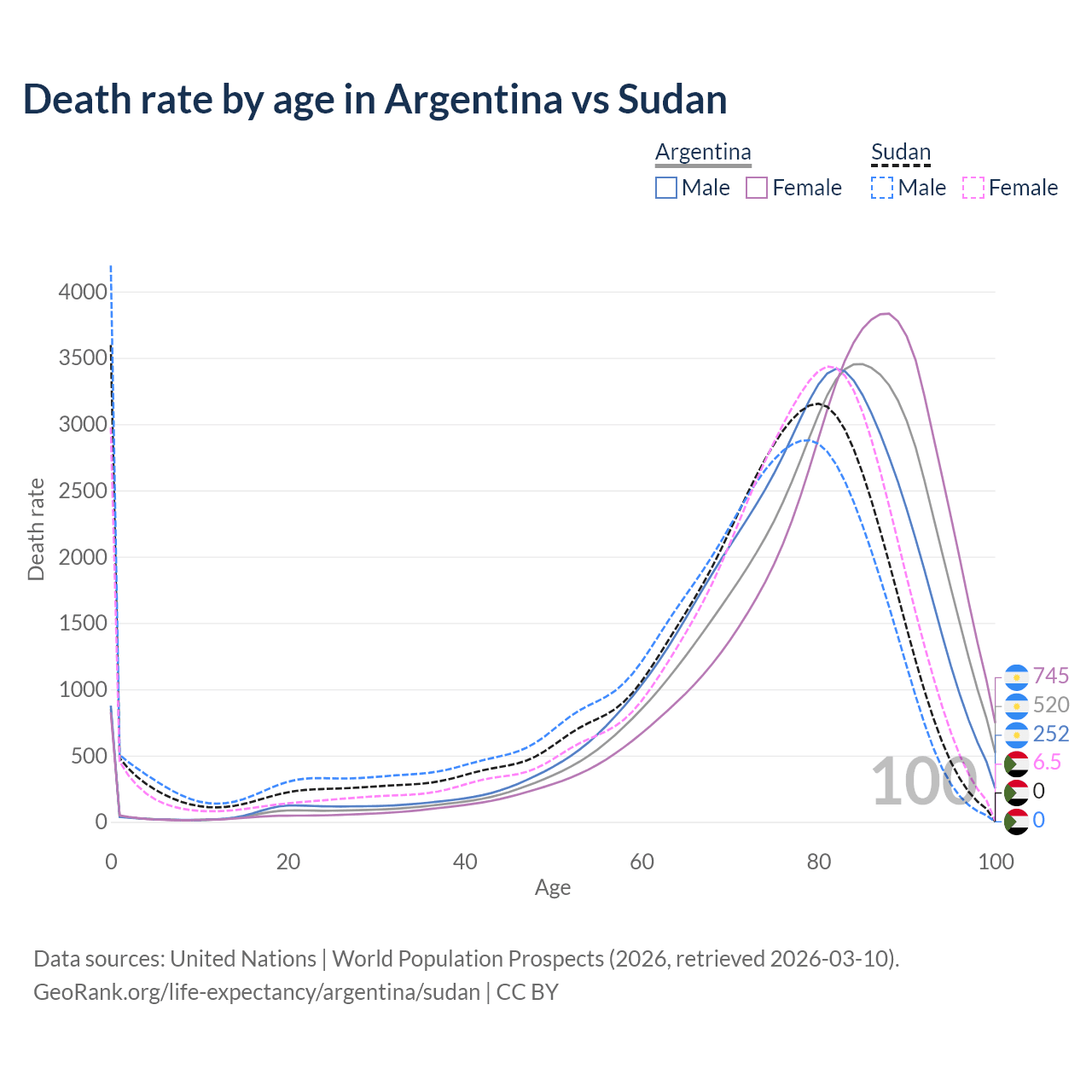 In Argentina, the most common age of death is 85, compared to 0 in Sudan. The median age of death is 81.4 in Argentina and 74.1 in Sudan, meaning only half of each cohort is expected to live past that age.