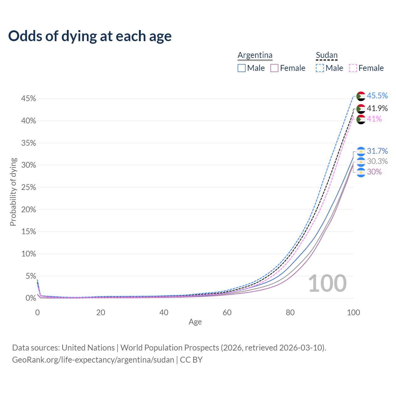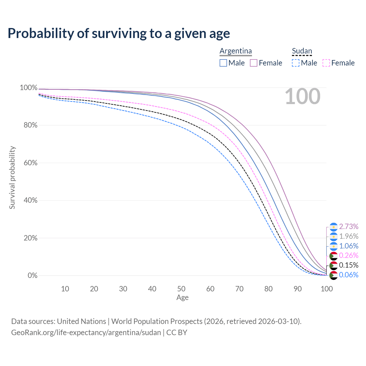 This life expectancy calculator shows the odds of living to 100, 95, 90, and below based on current age for both males and females in Argentina and Sudan, along with mean and median age of death. The calculations are based on the 2026 life tables (actuarial tables) from the UN World Population Prospects.