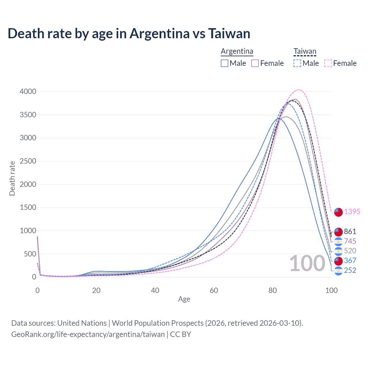 In Argentina, the most common age of death is 85, compared to 87 in Taiwan. The median age of death is 81.4 in Argentina and 84.3 in Taiwan, meaning only half of each cohort is expected to live past that age.