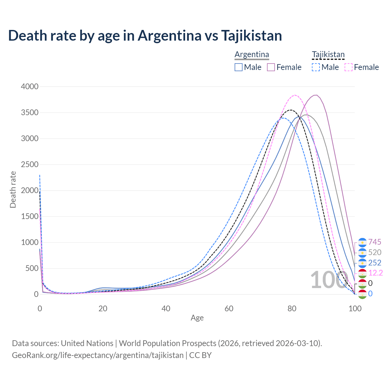 In Argentina, the most common age of death is 85, compared to 80 in Tajikistan. The median age of death is 81.4 in Argentina and 76 in Tajikistan, meaning only half of each cohort is expected to live past that age.