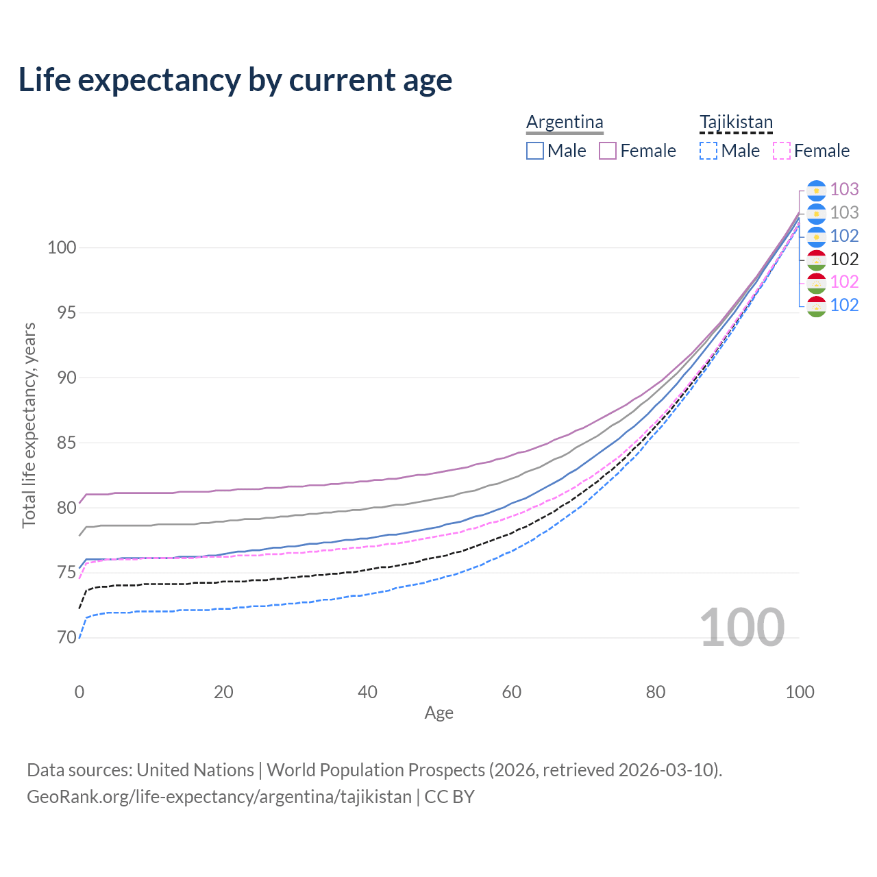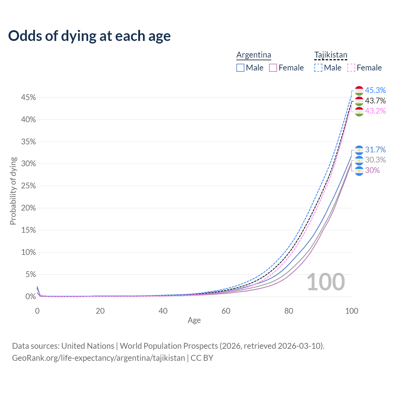 This life expectancy calculator shows the odds of living to 100, 95, 90, and below based on current age for both males and females in Argentina and Tajikistan, along with mean and median age of death. The calculations are based on the 2026 life tables (actuarial tables) from the UN World Population Prospects.