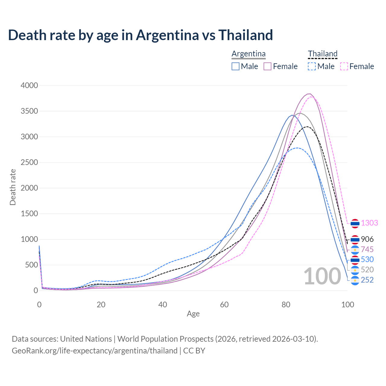 In Argentina, the most common age of death is 85, compared to 87 in Thailand. The median age of death is 81.4 in Argentina and 81.8 in Thailand, meaning only half of each cohort is expected to live past that age.