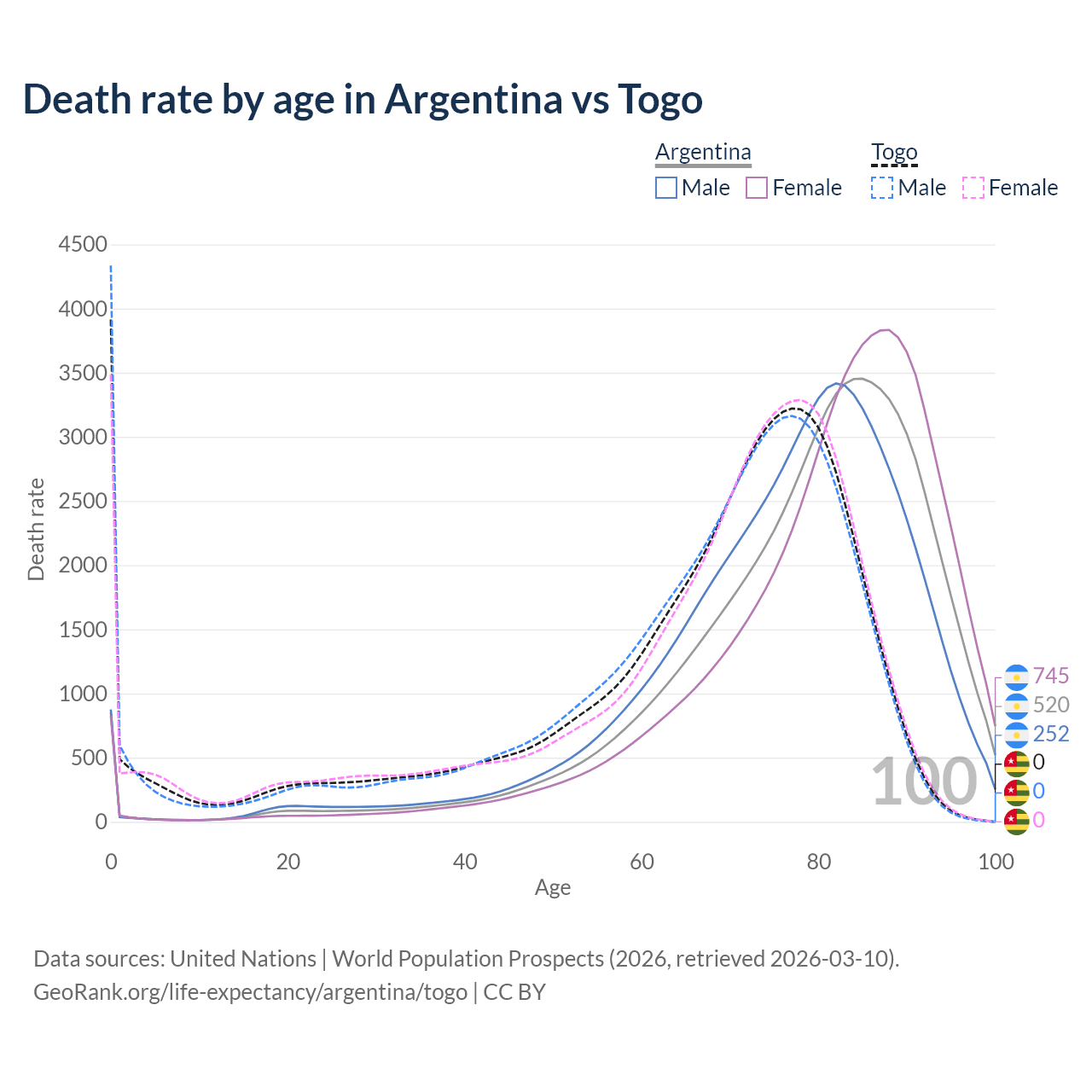 In Argentina, the most common age of death is 85, compared to 0 in Togo. The median age of death is 81.4 in Argentina and 71 in Togo, meaning only half of each cohort is expected to live past that age.
