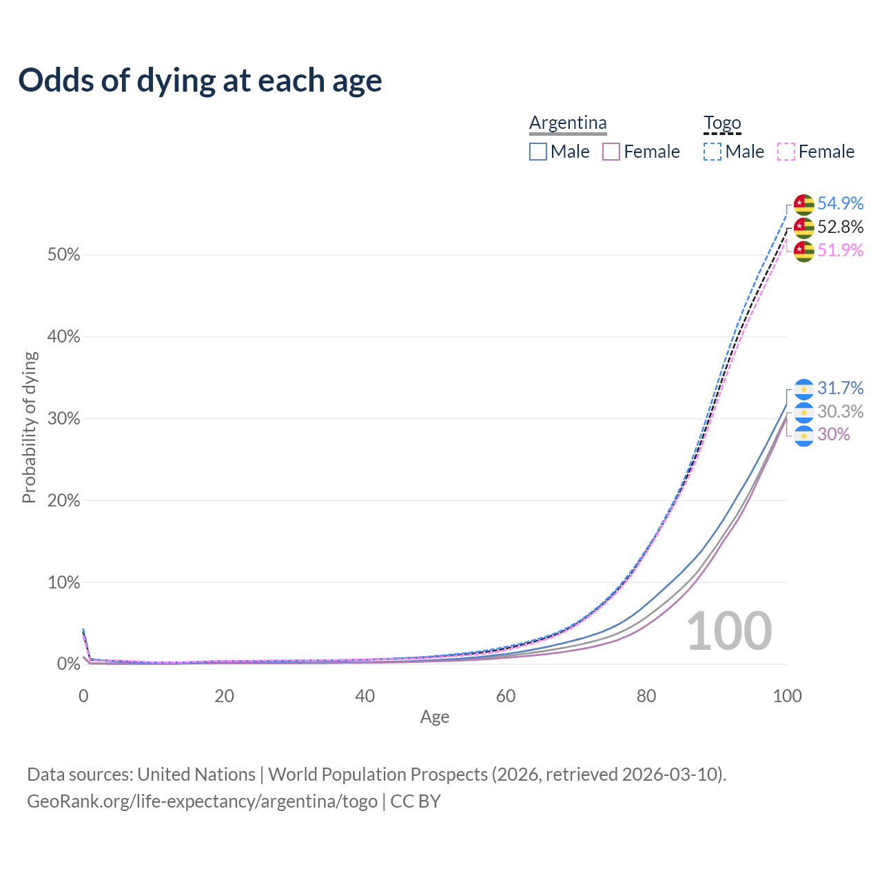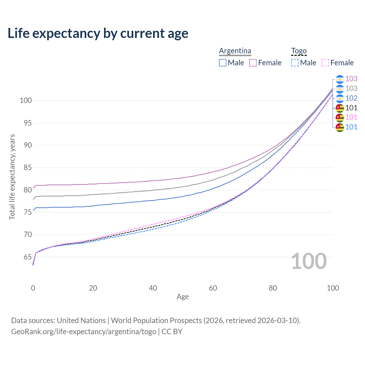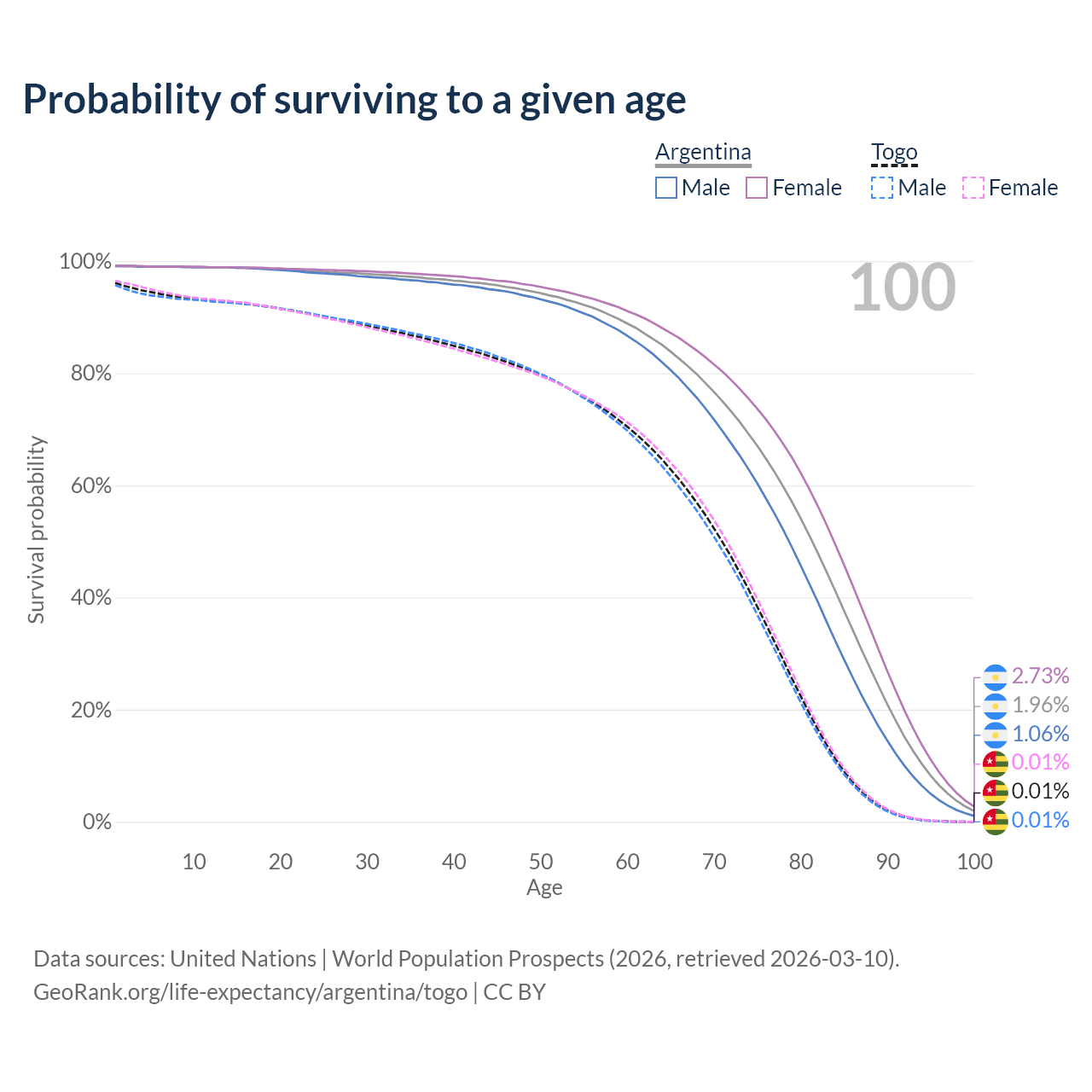 This life expectancy calculator shows the odds of living to 100, 95, 90, and below based on current age for both males and females in Argentina and Togo, along with mean and median age of death. The calculations are based on the 2026 life tables (actuarial tables) from the UN World Population Prospects.