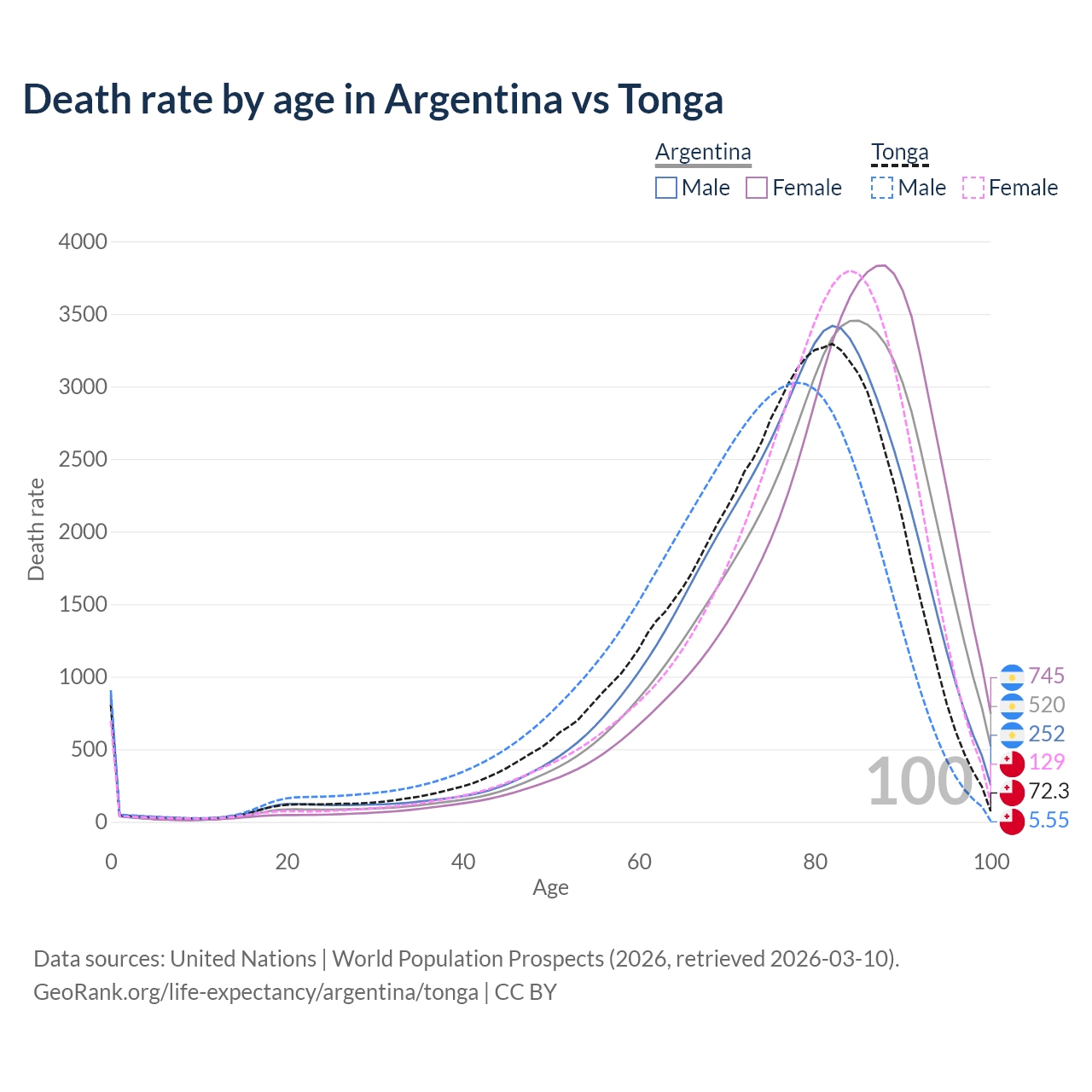 In Argentina, the most common age of death is 85, compared to 82 in Tonga. The median age of death is 81.4 in Argentina and 77 in Tonga, meaning only half of each cohort is expected to live past that age.