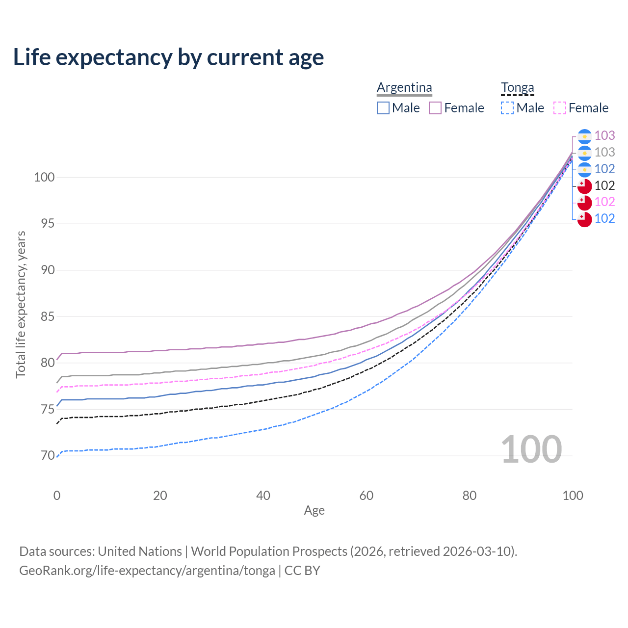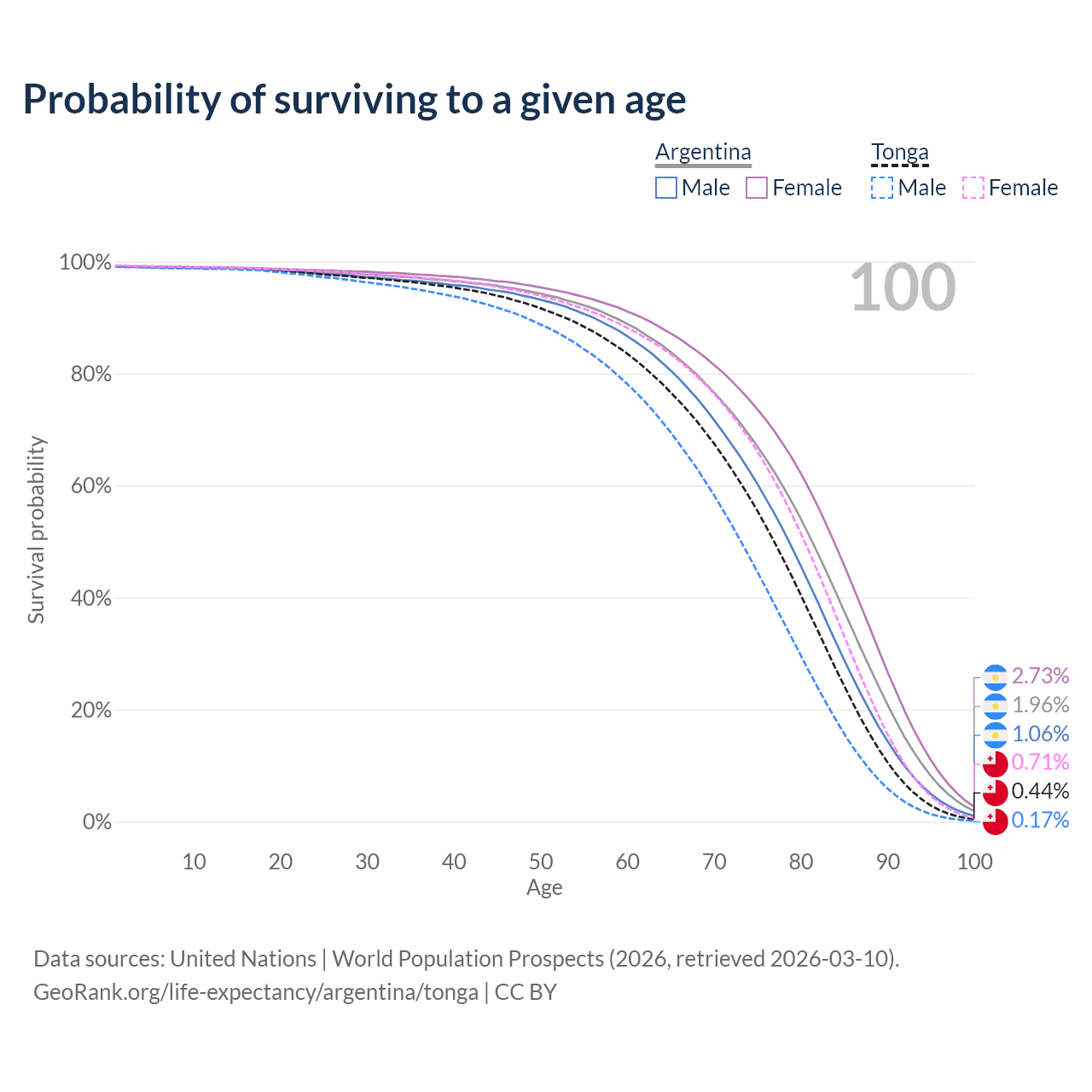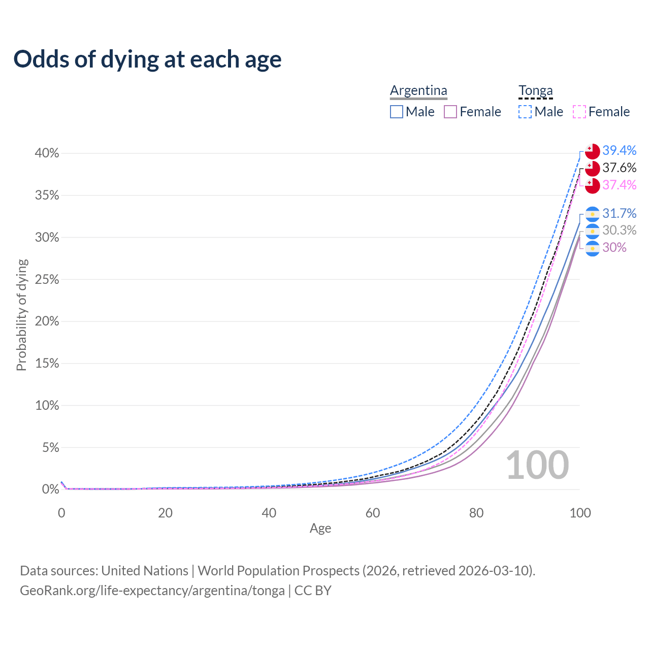 This life expectancy calculator shows the odds of living to 100, 95, 90, and below based on current age for both males and females in Argentina and Tonga, along with mean and median age of death. The calculations are based on the 2026 life tables (actuarial tables) from the UN World Population Prospects.