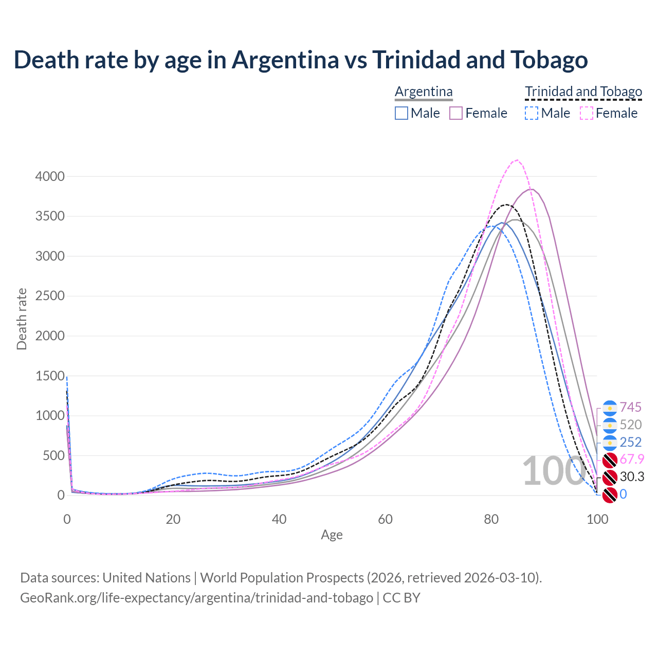 In Argentina, the most common age of death is 85, compared to 83 in Trinidad and Tobago. The median age of death is 81.4 in Argentina and 78.4 in Trinidad and Tobago, meaning only half of each cohort is expected to live past that age.