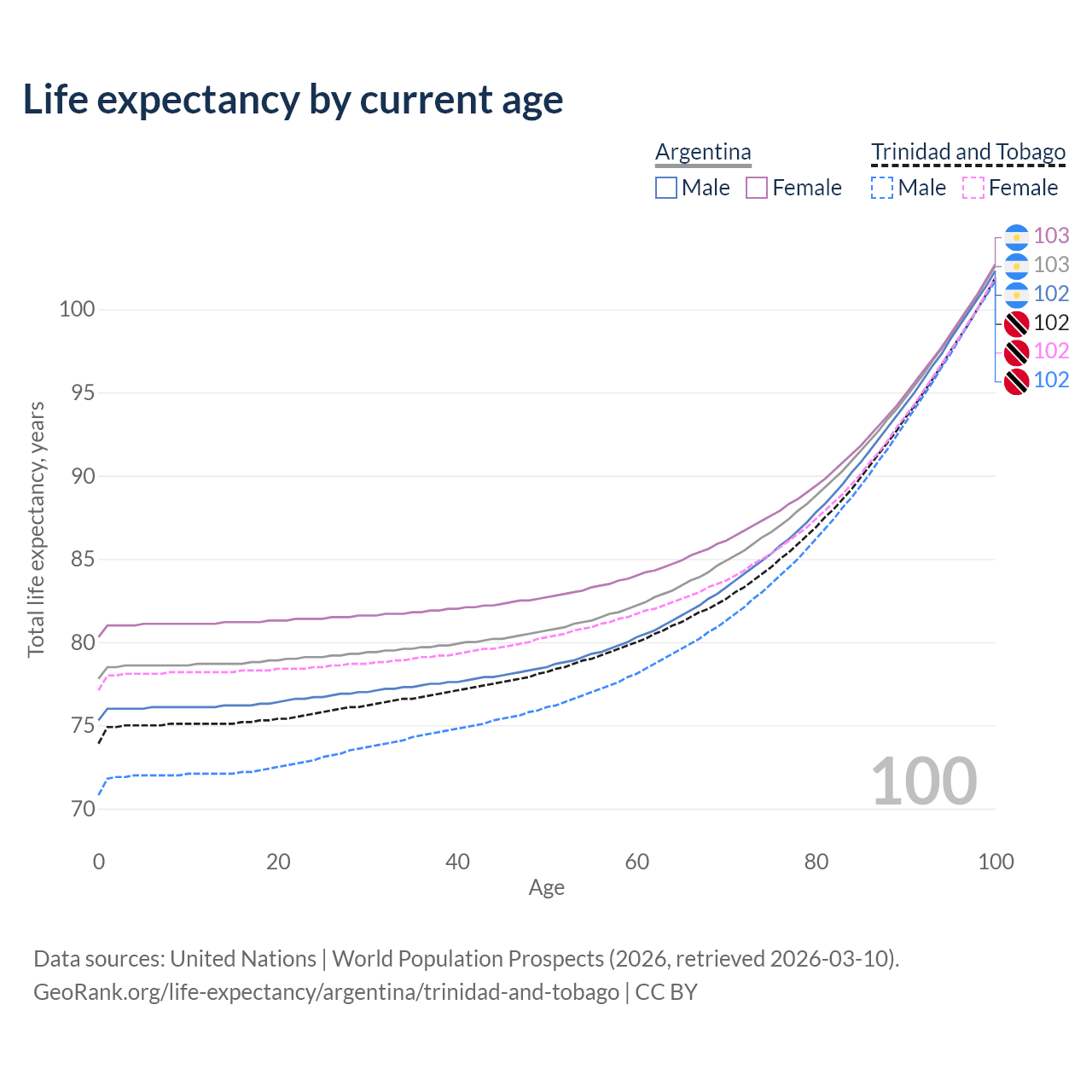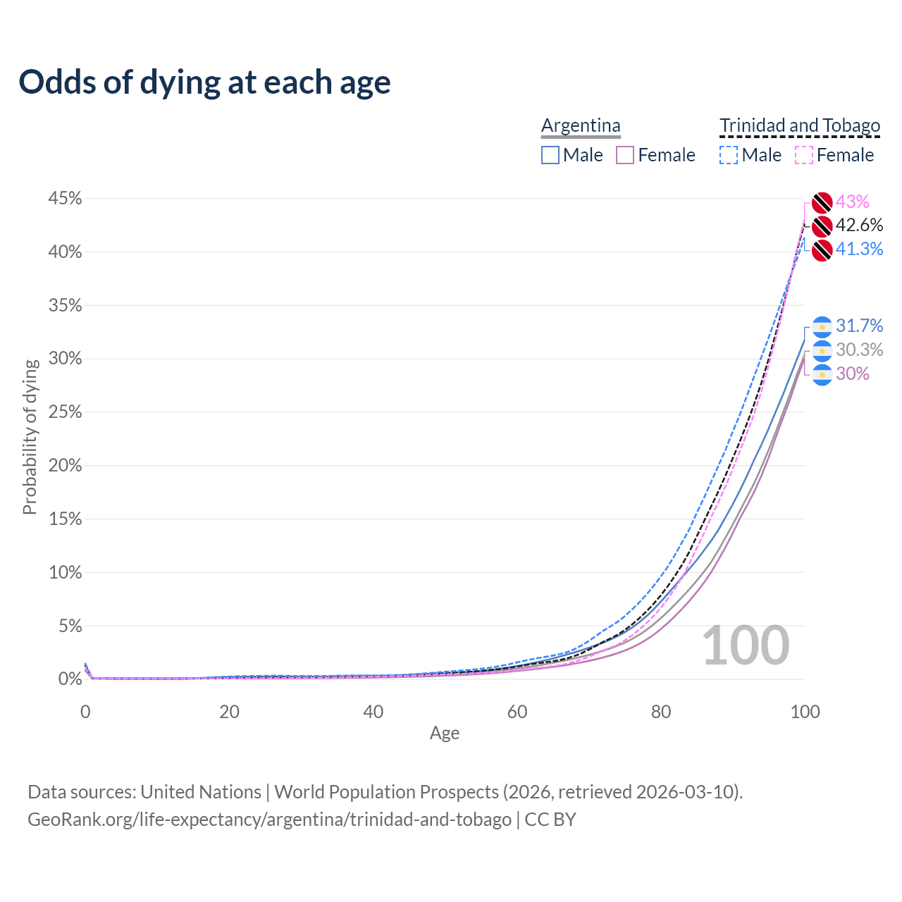 This life expectancy calculator shows the odds of living to 100, 95, 90, and below based on current age for both males and females in Argentina and Trinidad and Tobago, along with mean and median age of death. The calculations are based on the 2026 life tables (actuarial tables) from the UN World Population Prospects.