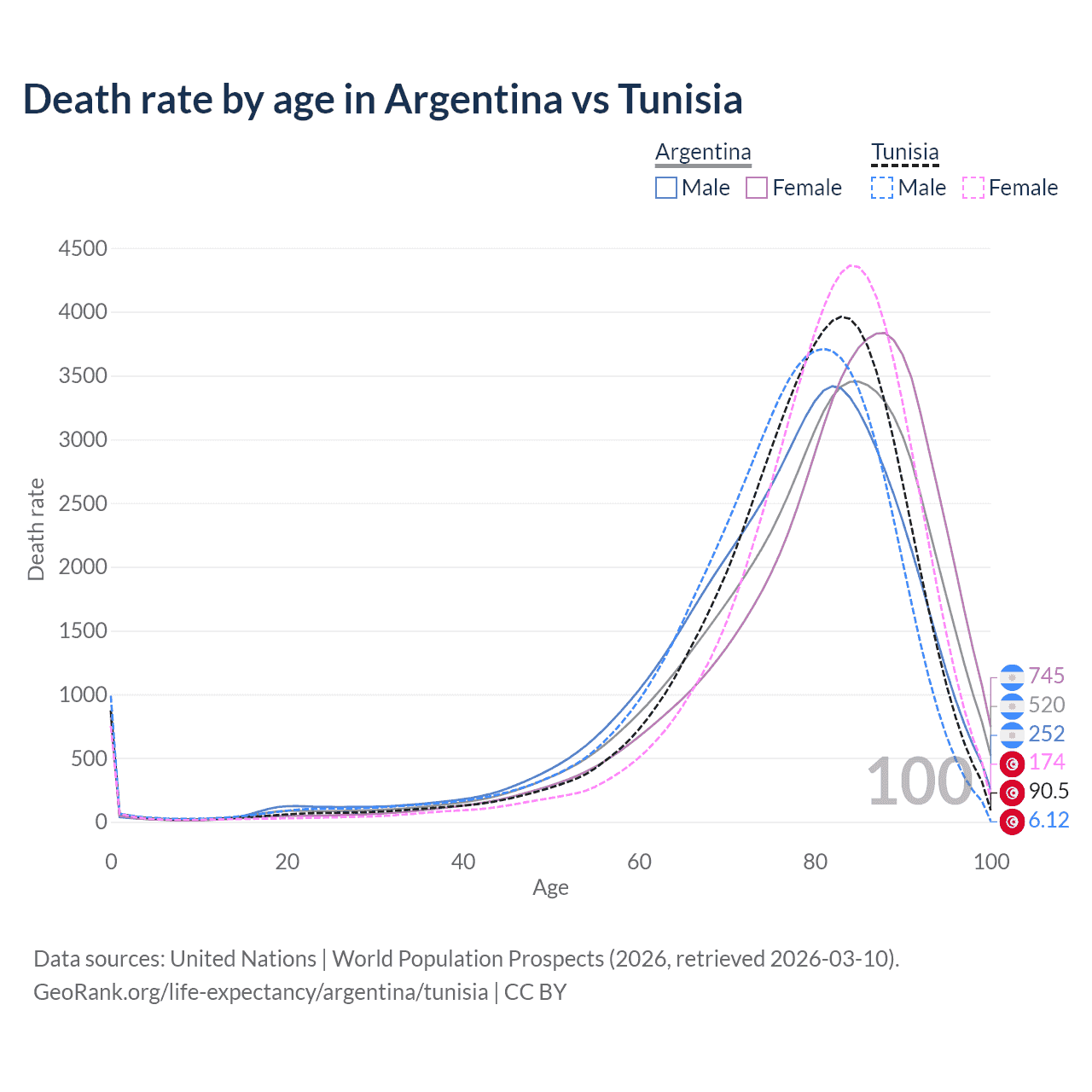 In Argentina, the most common age of death is 85, compared to 83 in Tunisia. The median age of death is 81.4 in Argentina and 80.2 in Tunisia, meaning only half of each cohort is expected to live past that age.