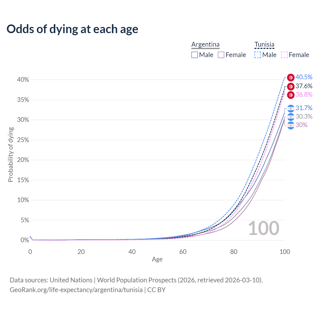 This life expectancy calculator shows the odds of living to 100, 95, 90, and below based on current age for both males and females in Argentina and Tunisia, along with mean and median age of death. The calculations are based on the 2026 life tables (actuarial tables) from the UN World Population Prospects.