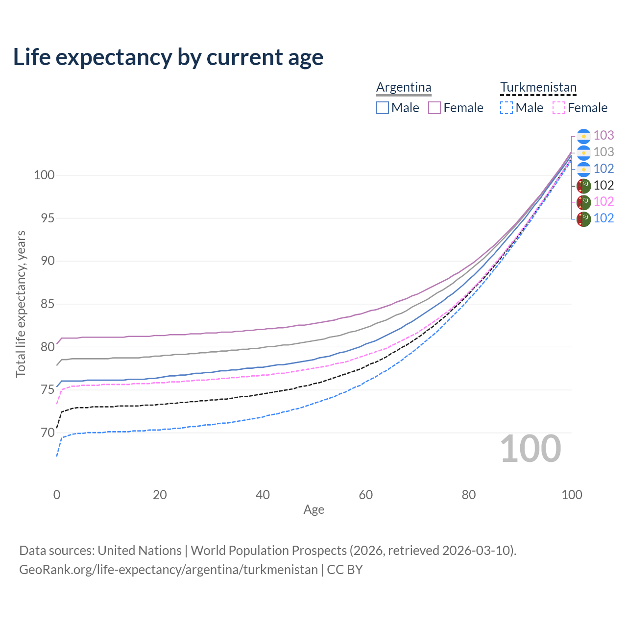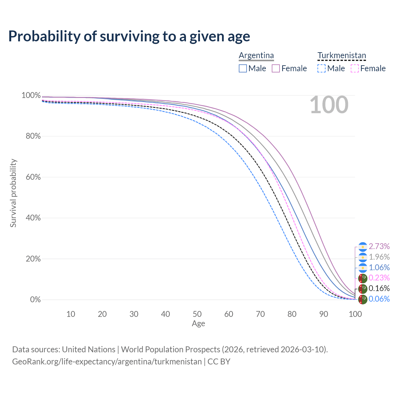 This life expectancy calculator shows the odds of living to 100, 95, 90, and below based on current age for both males and females in Argentina and Turkmenistan, along with mean and median age of death. The calculations are based on the 2026 life tables (actuarial tables) from the UN World Population Prospects.