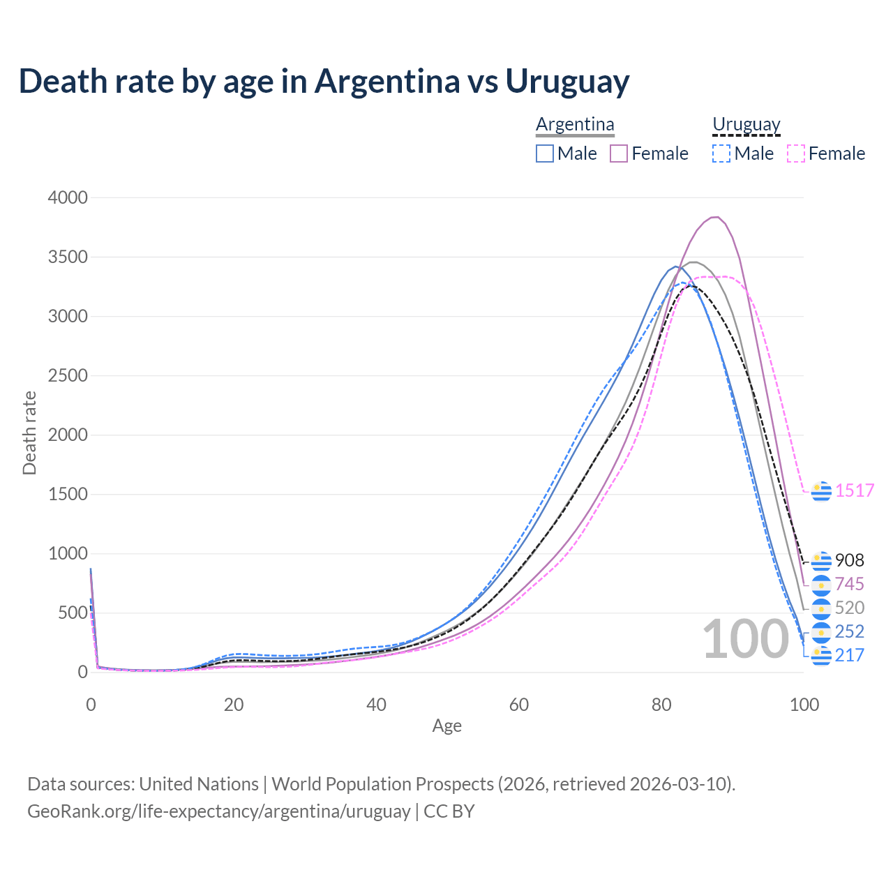 In Argentina, the most common age of death is 85, compared to 84 in Uruguay. The median age of death is 81.4 in Argentina and 81.8 in Uruguay, meaning only half of each cohort is expected to live past that age.