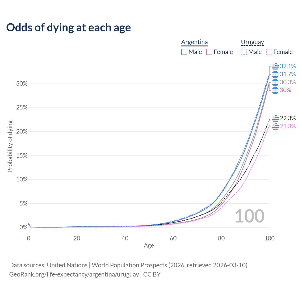 This life expectancy calculator shows the odds of living to 100, 95, 90, and below based on current age for both males and females in Argentina and Uruguay, along with mean and median age of death. The calculations are based on the 2026 life tables (actuarial tables) from the UN World Population Prospects.