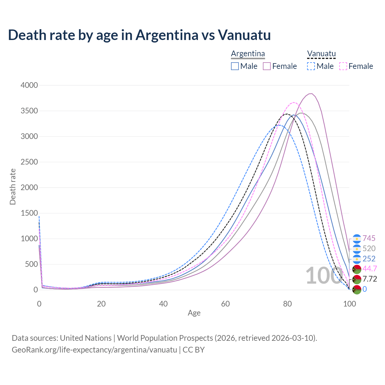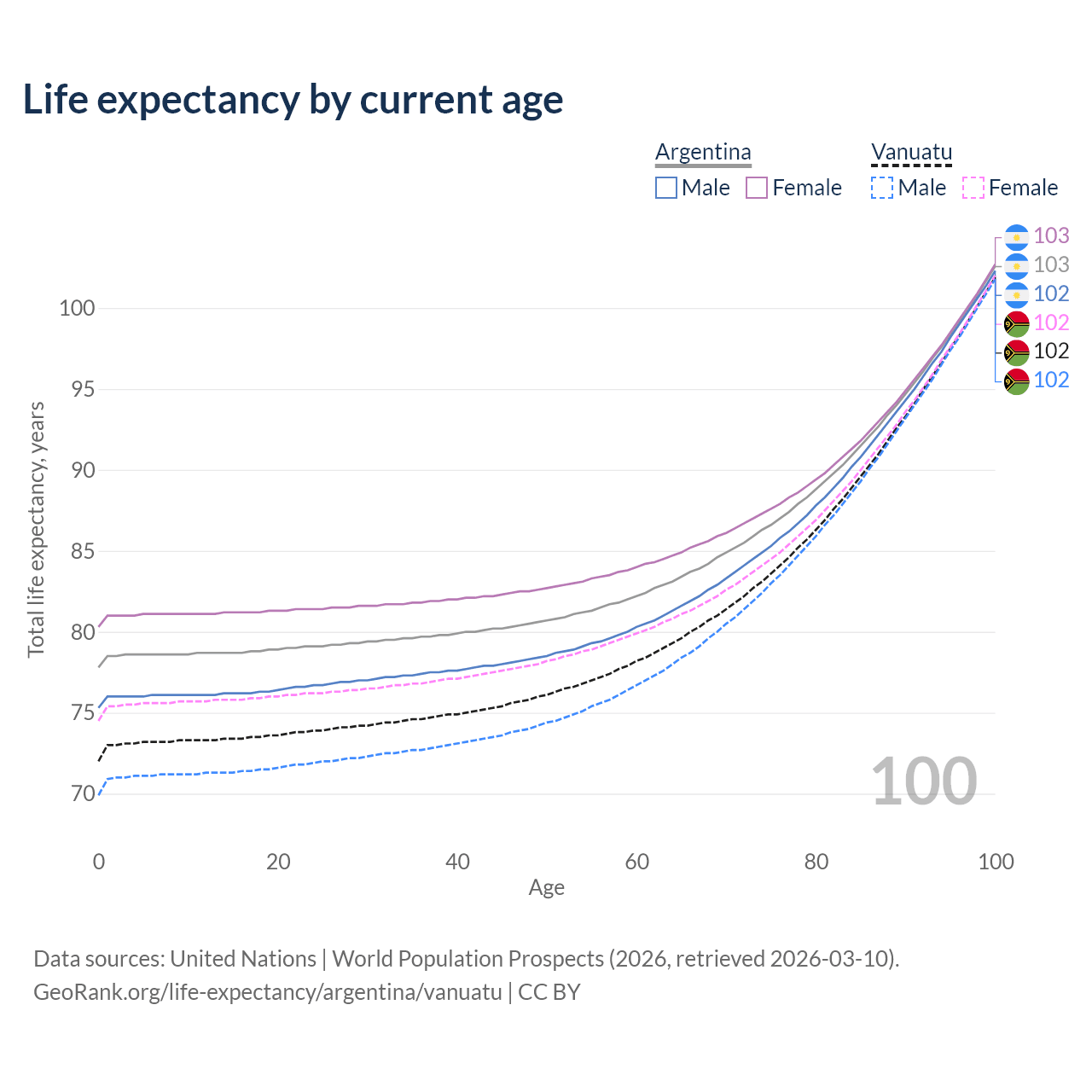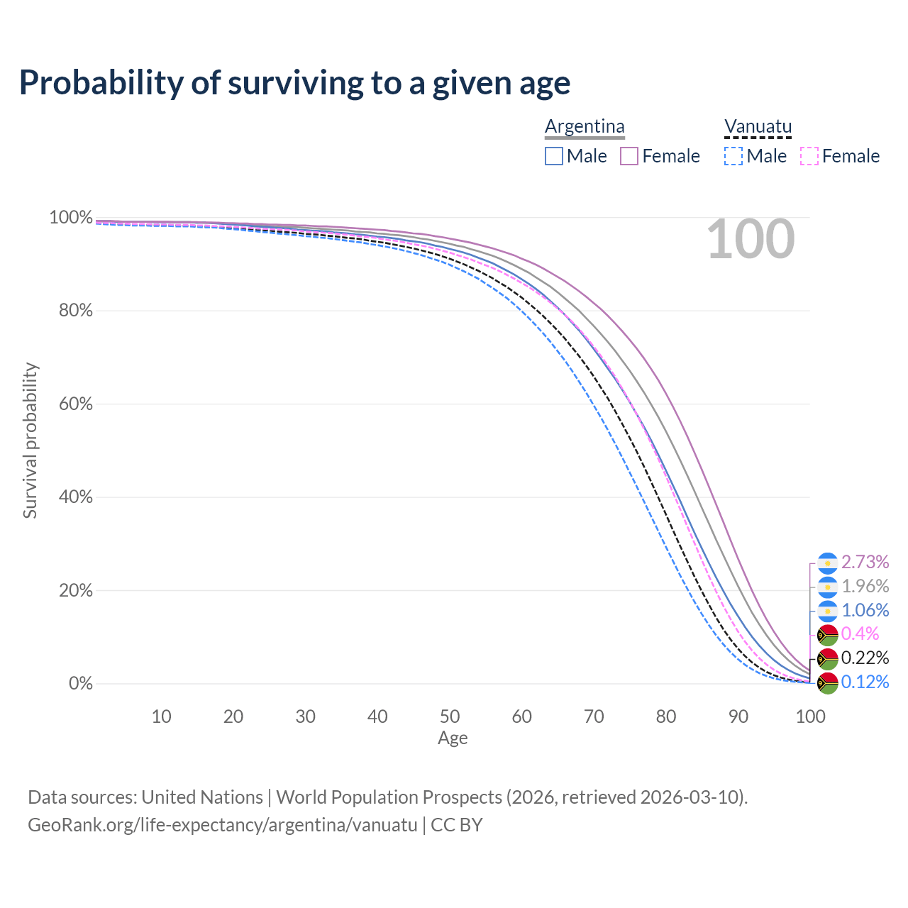 This life expectancy calculator shows the odds of living to 100, 95, 90, and below based on current age for both males and females in Argentina and Vanuatu, along with mean and median age of death. The calculations are based on the 2026 life tables (actuarial tables) from the UN World Population Prospects.