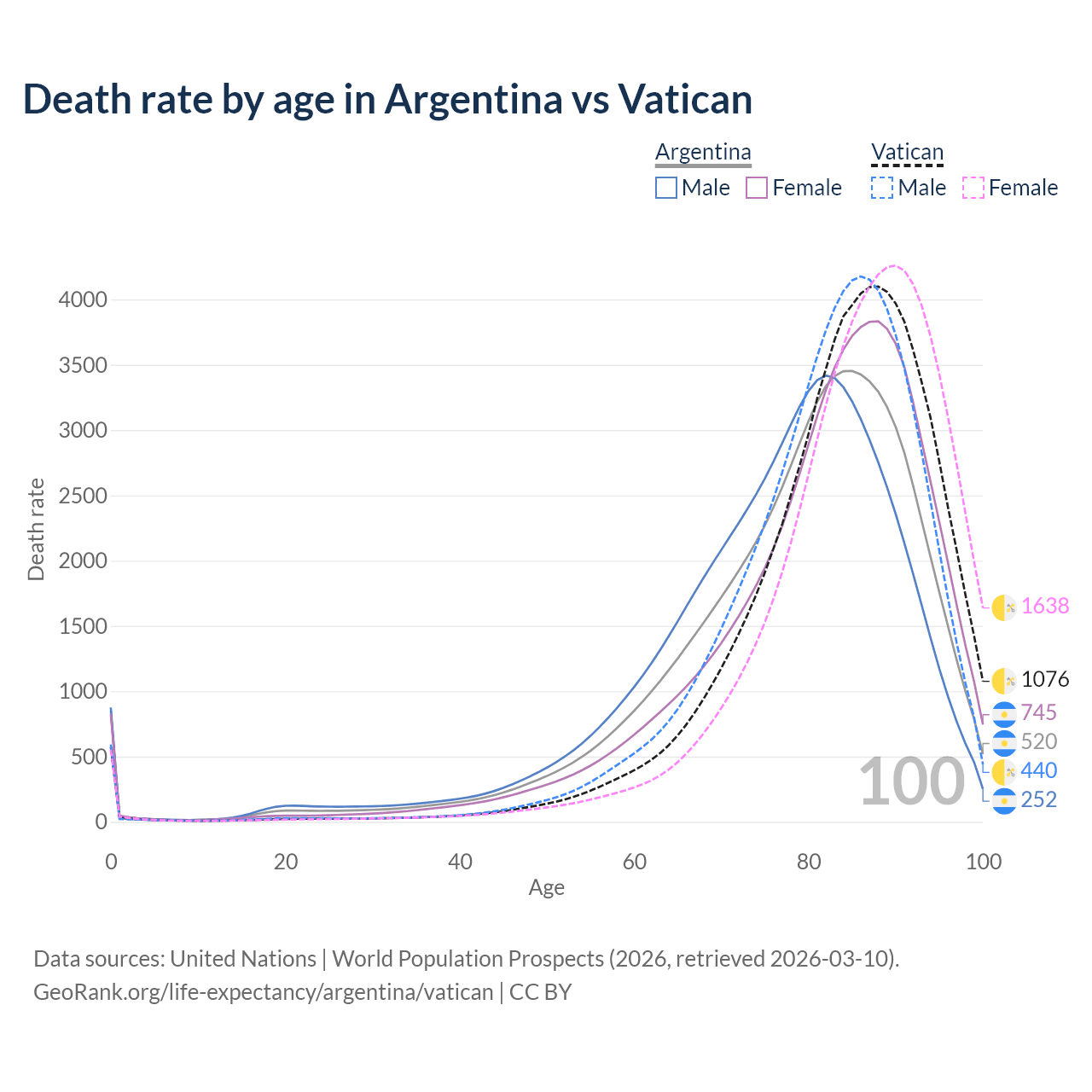 In Argentina, the most common age of death is 85, compared to 88 in the Vatican. The median age of death is 81.4 in Argentina and 85.7 in the Vatican, meaning only half of each cohort is expected to live past that age.