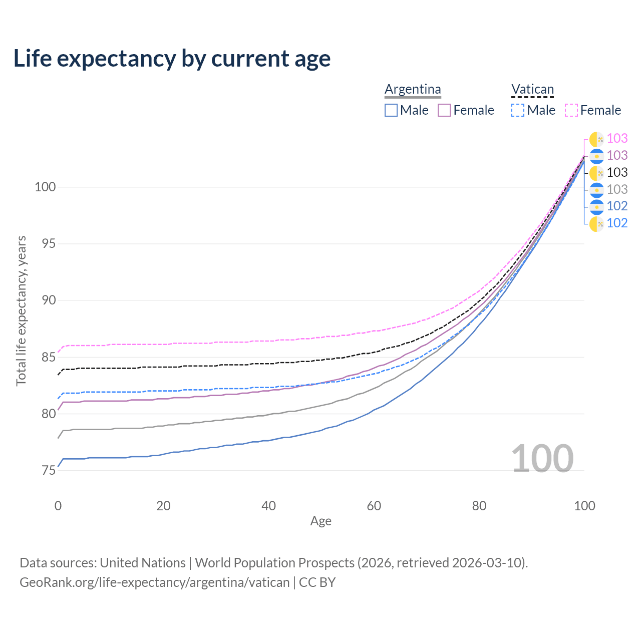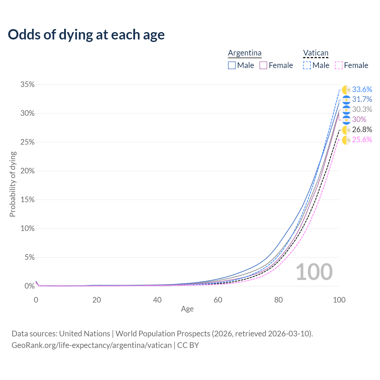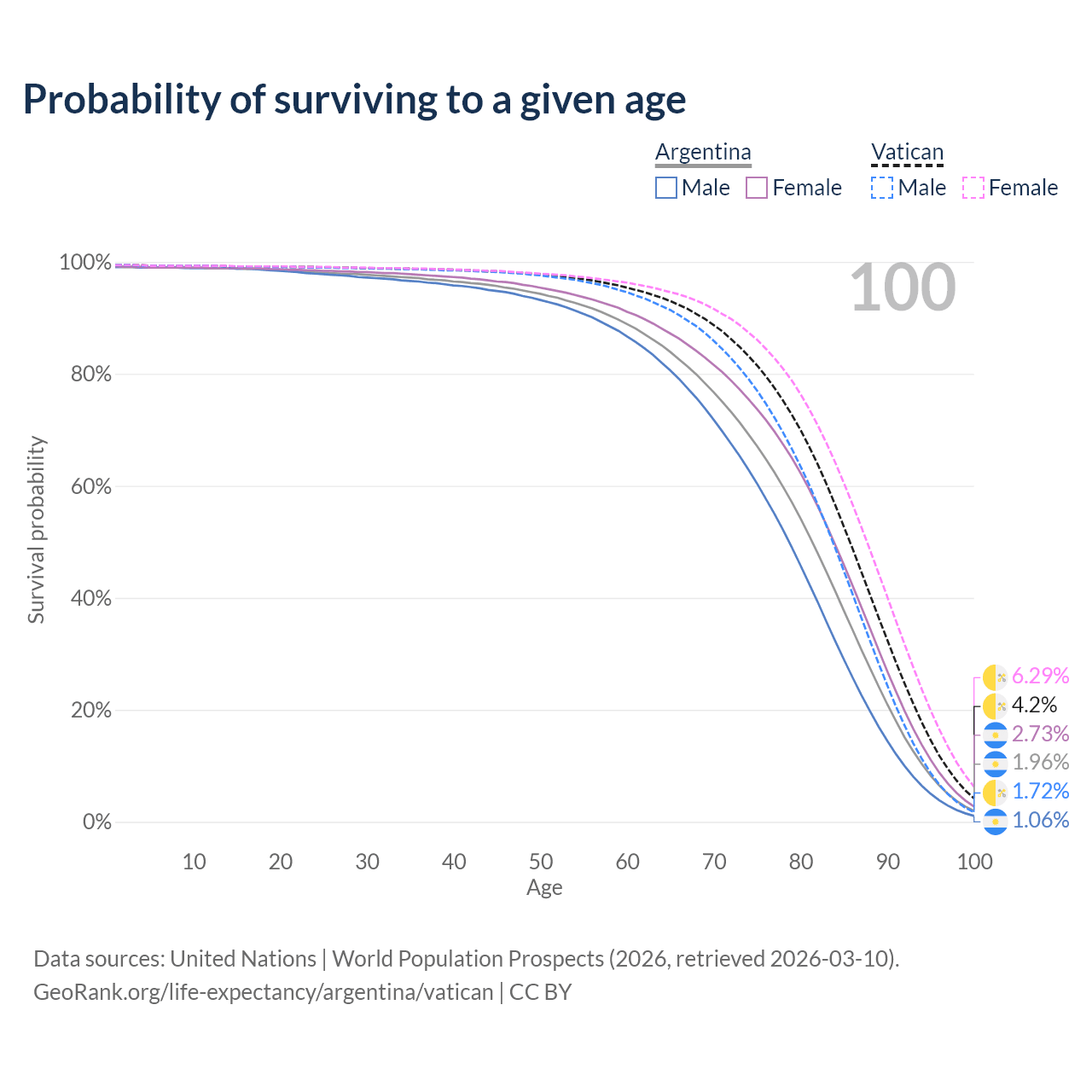 This life expectancy calculator shows the odds of living to 100, 95, 90, and below based on current age for both males and females in Argentina and the Vatican, along with mean and median age of death. The calculations are based on the 2026 life tables (actuarial tables) from the UN World Population Prospects.