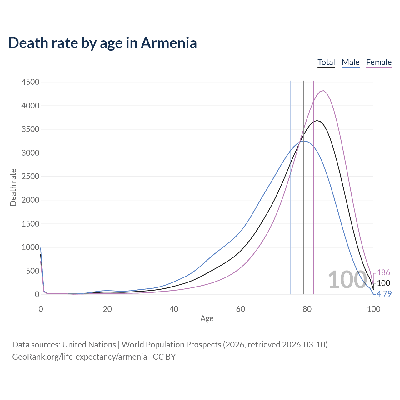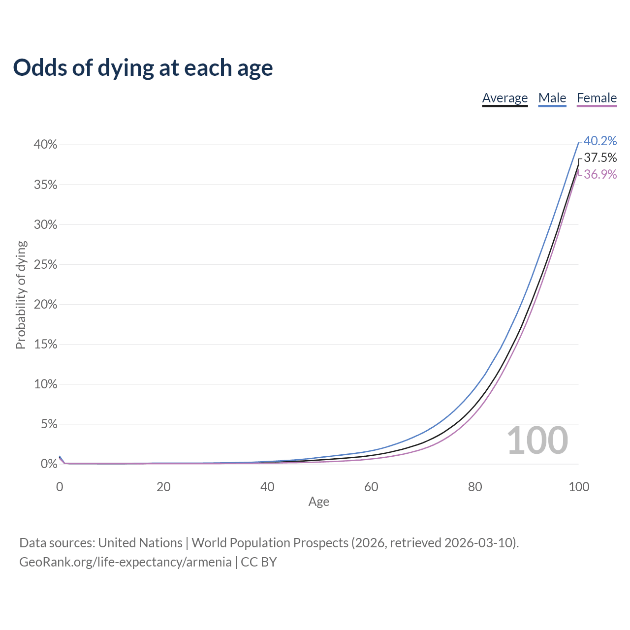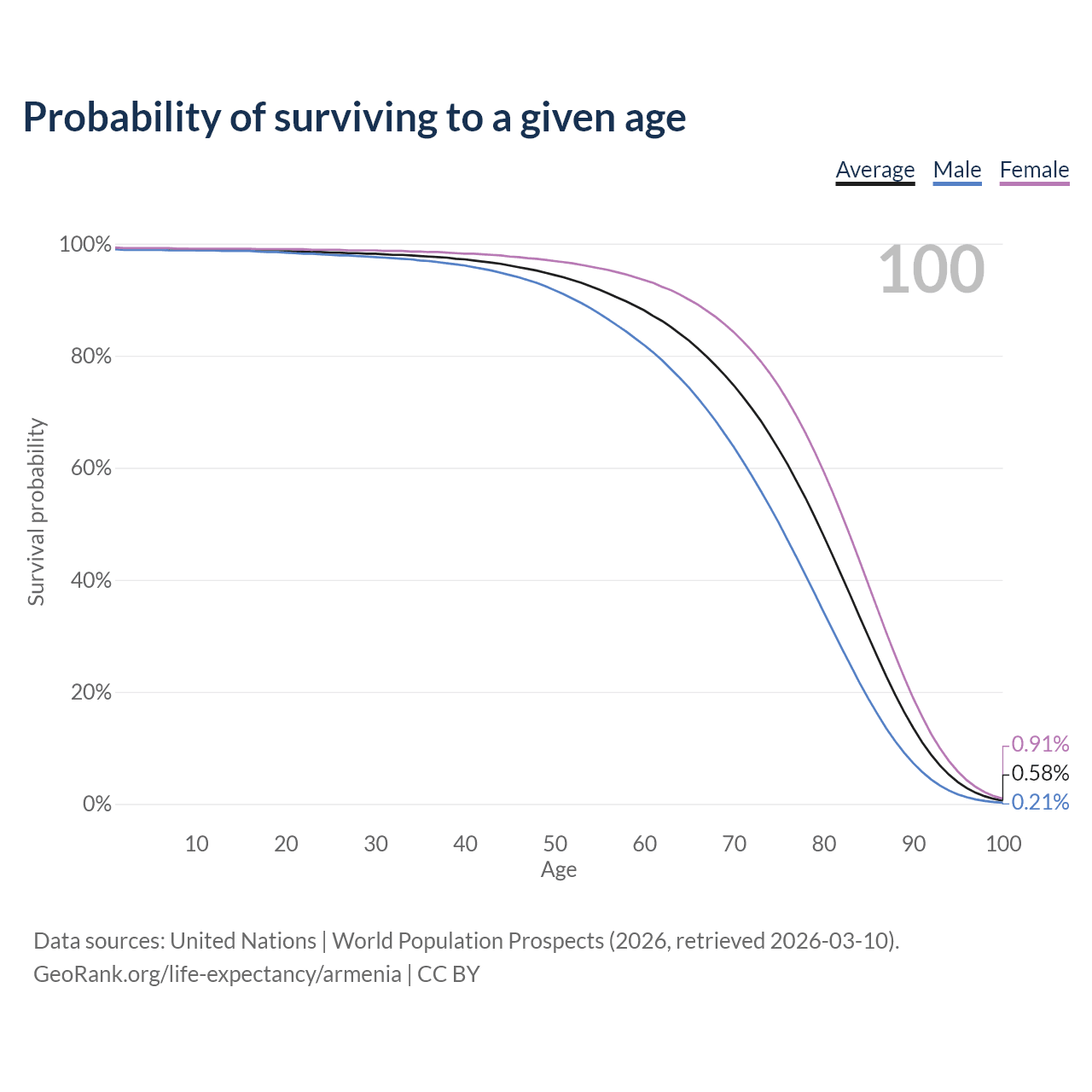 This life expectancy calculator shows the odds of living to 100, 95, 90, and below based on current age for both males and females in Armenia, along with mean and median age of death. The calculations are based on the 2026 life tables (actuarial tables) from the UN World Population Prospects.