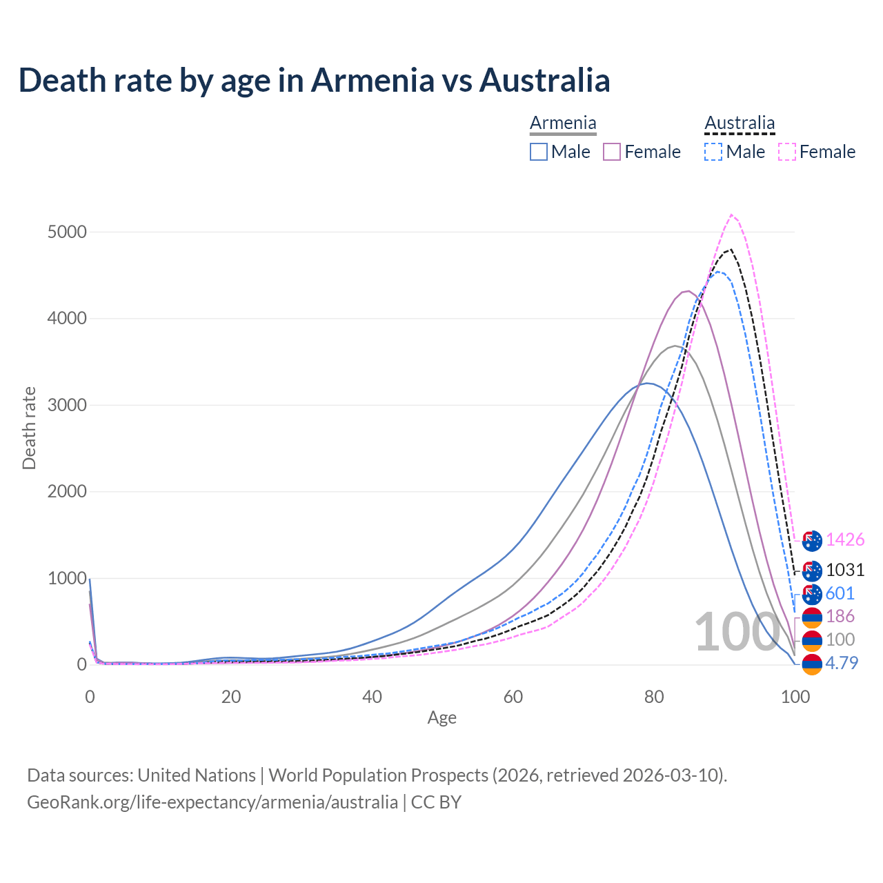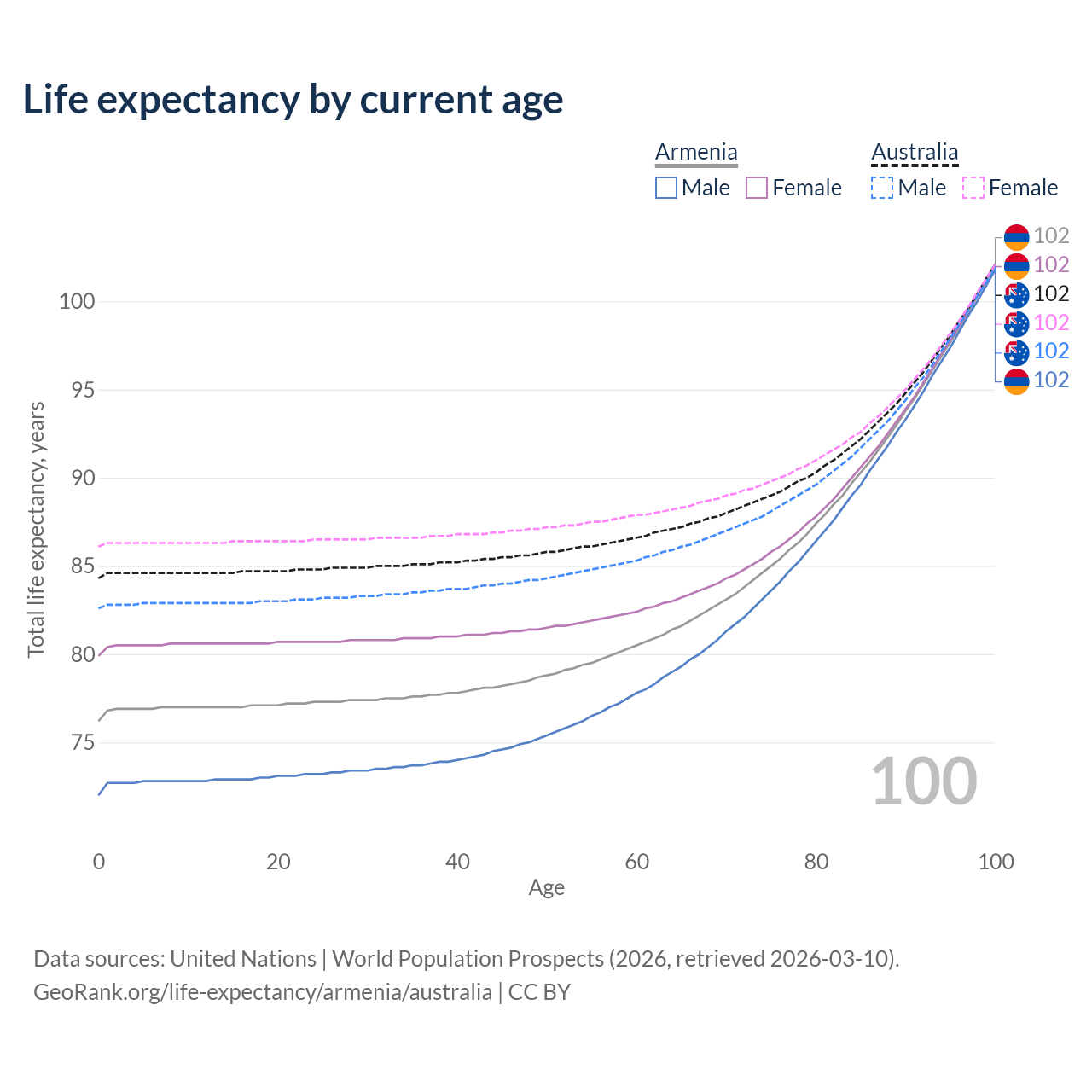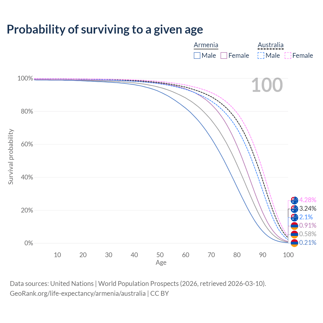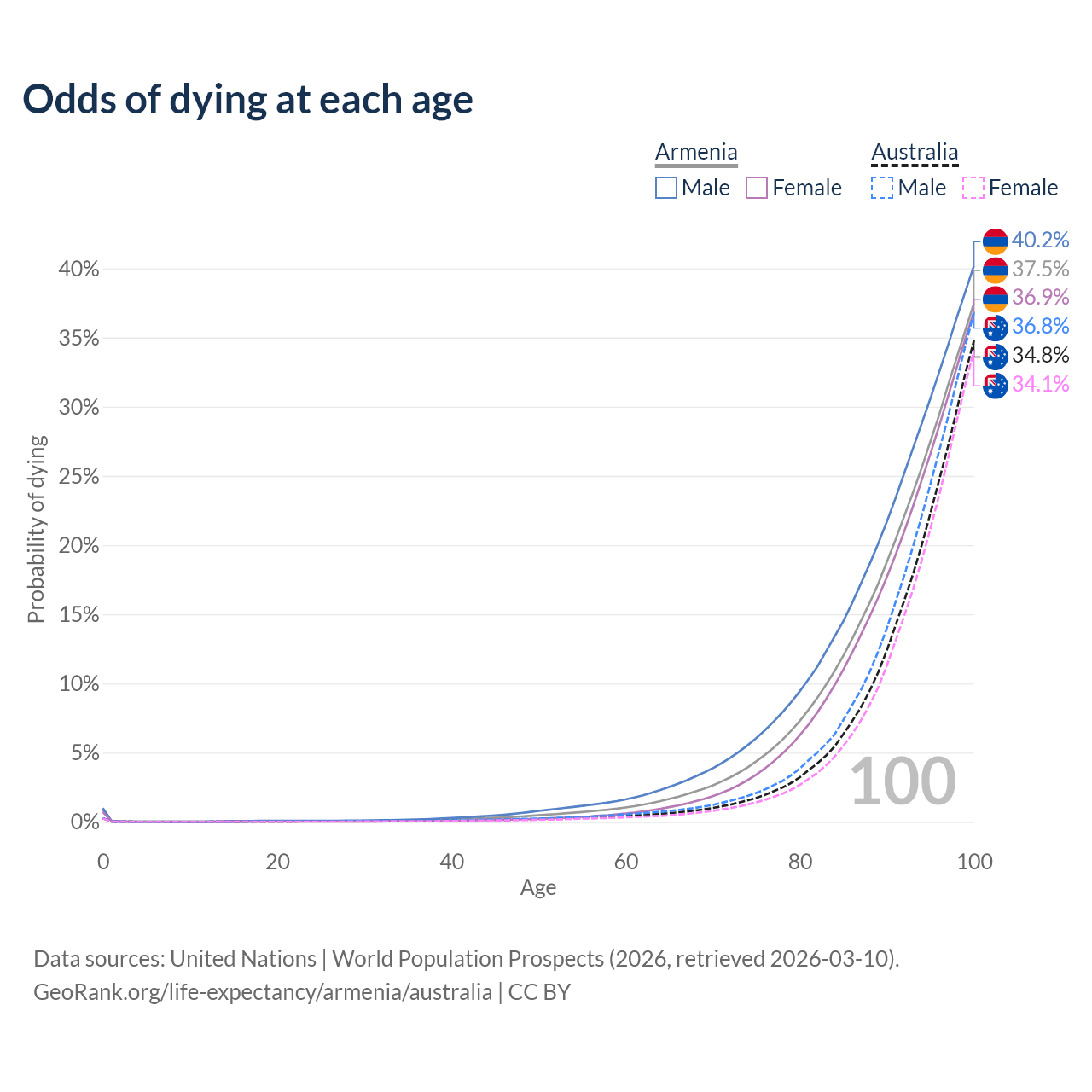 This life expectancy calculator shows the odds of living to 100, 95, 90, and below based on current age for both males and females in Armenia and Australia, along with mean and median age of death. The calculations are based on the 2026 life tables (actuarial tables) from the UN World Population Prospects.