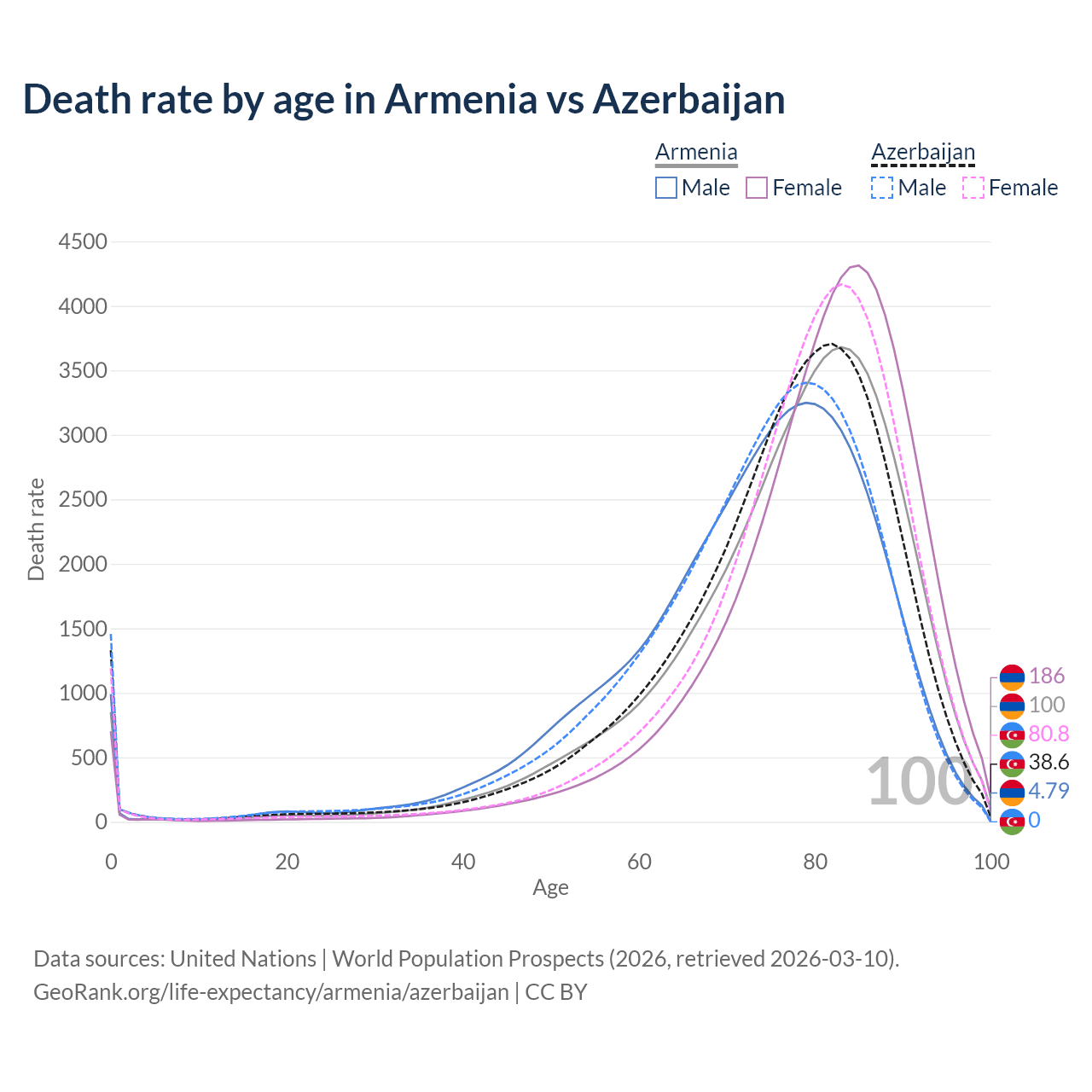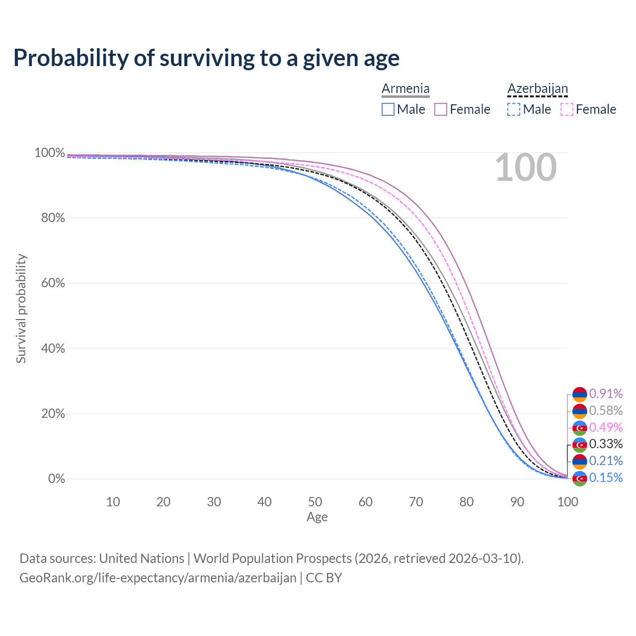 This life expectancy calculator shows the odds of living to 100, 95, 90, and below based on current age for both males and females in Armenia and Azerbaijan, along with mean and median age of death. The calculations are based on the 2026 life tables (actuarial tables) from the UN World Population Prospects.