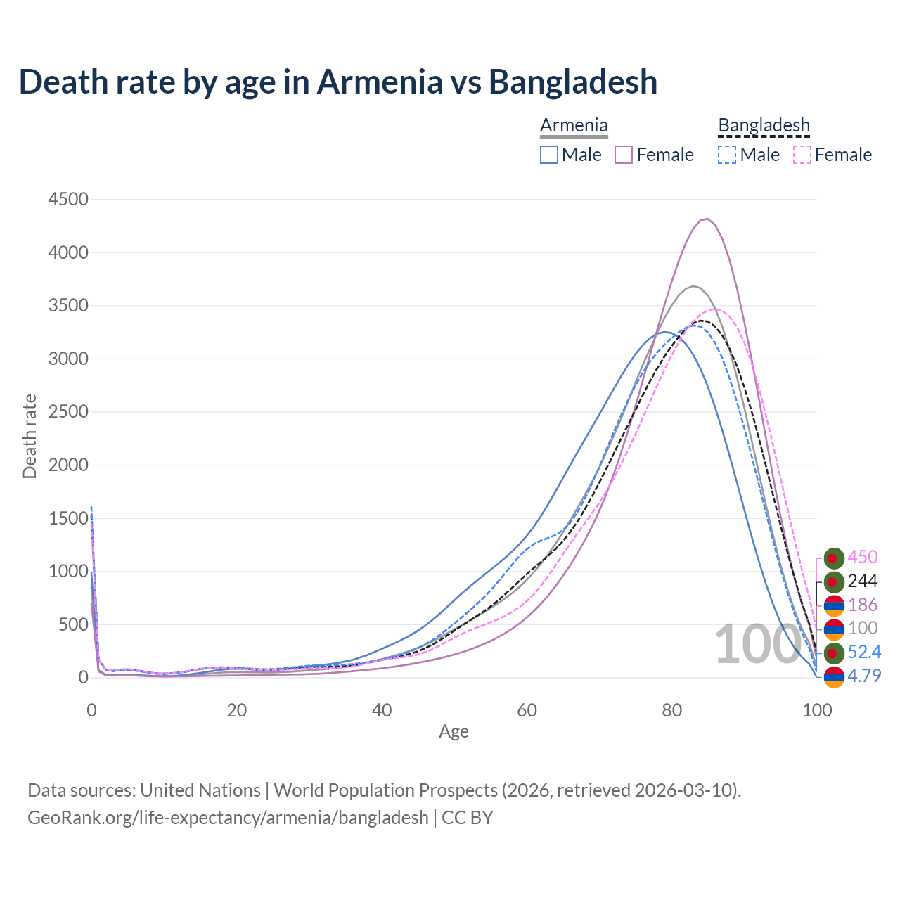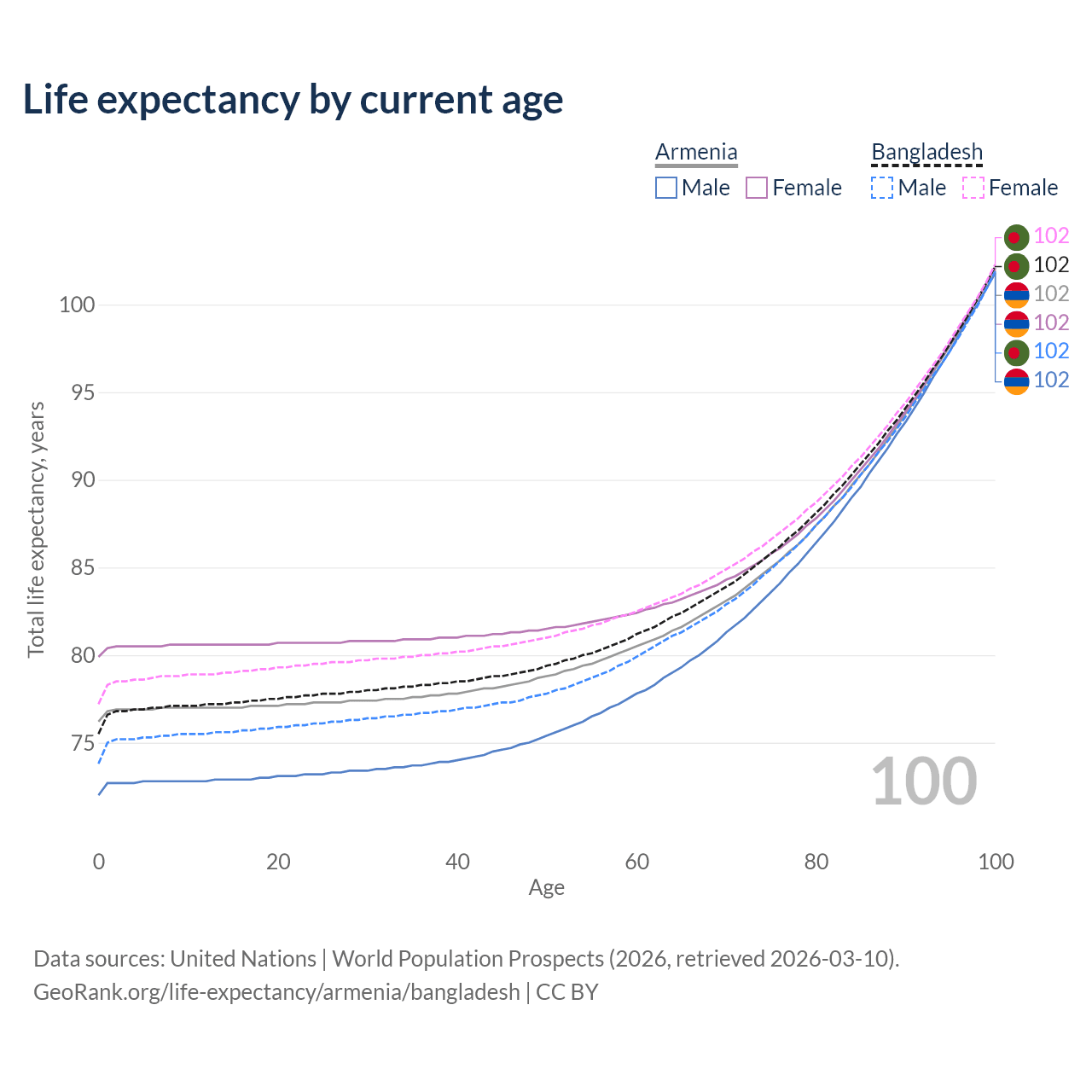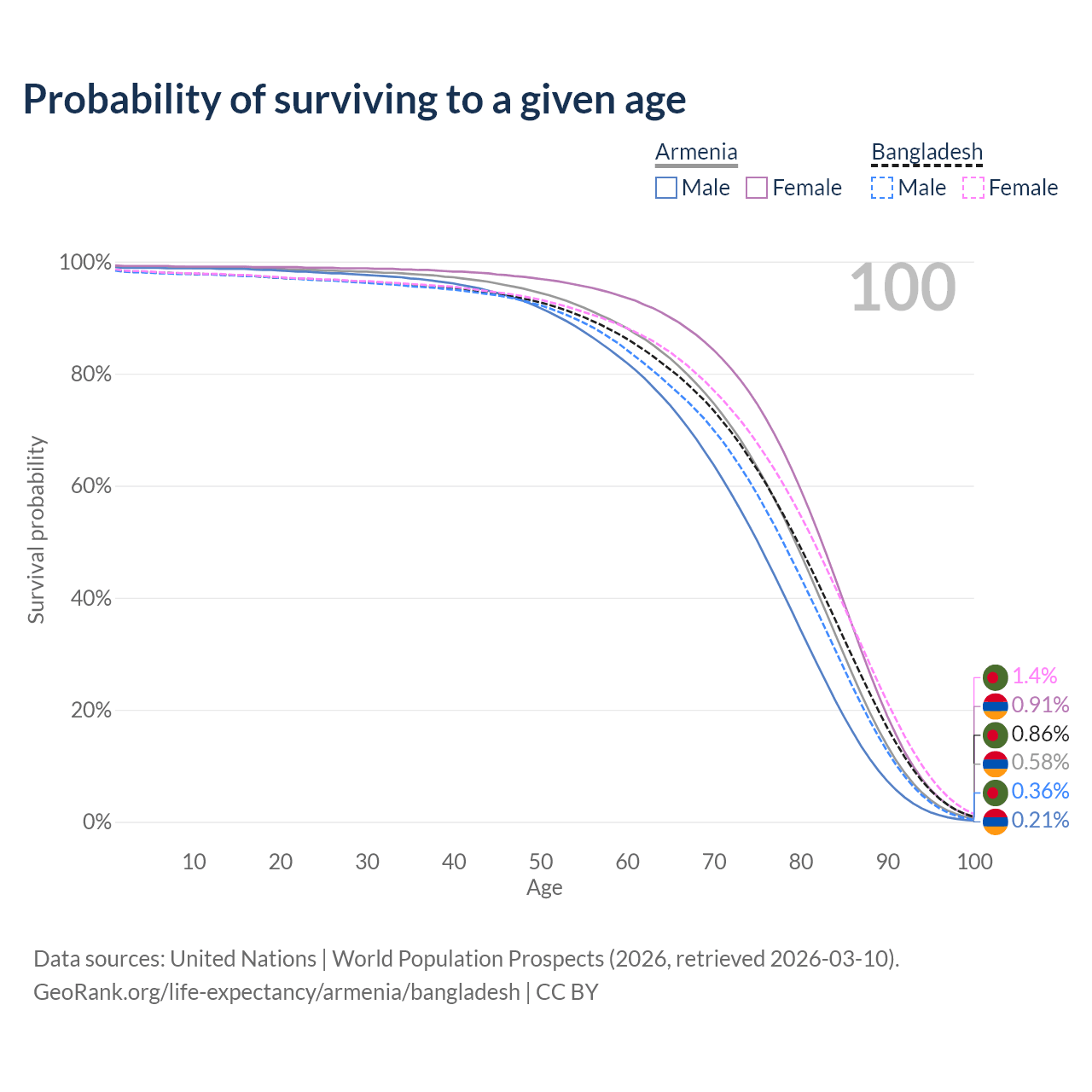 This life expectancy calculator shows the odds of living to 100, 95, 90, and below based on current age for both males and females in Armenia and Bangladesh, along with mean and median age of death. The calculations are based on the 2026 life tables (actuarial tables) from the UN World Population Prospects.