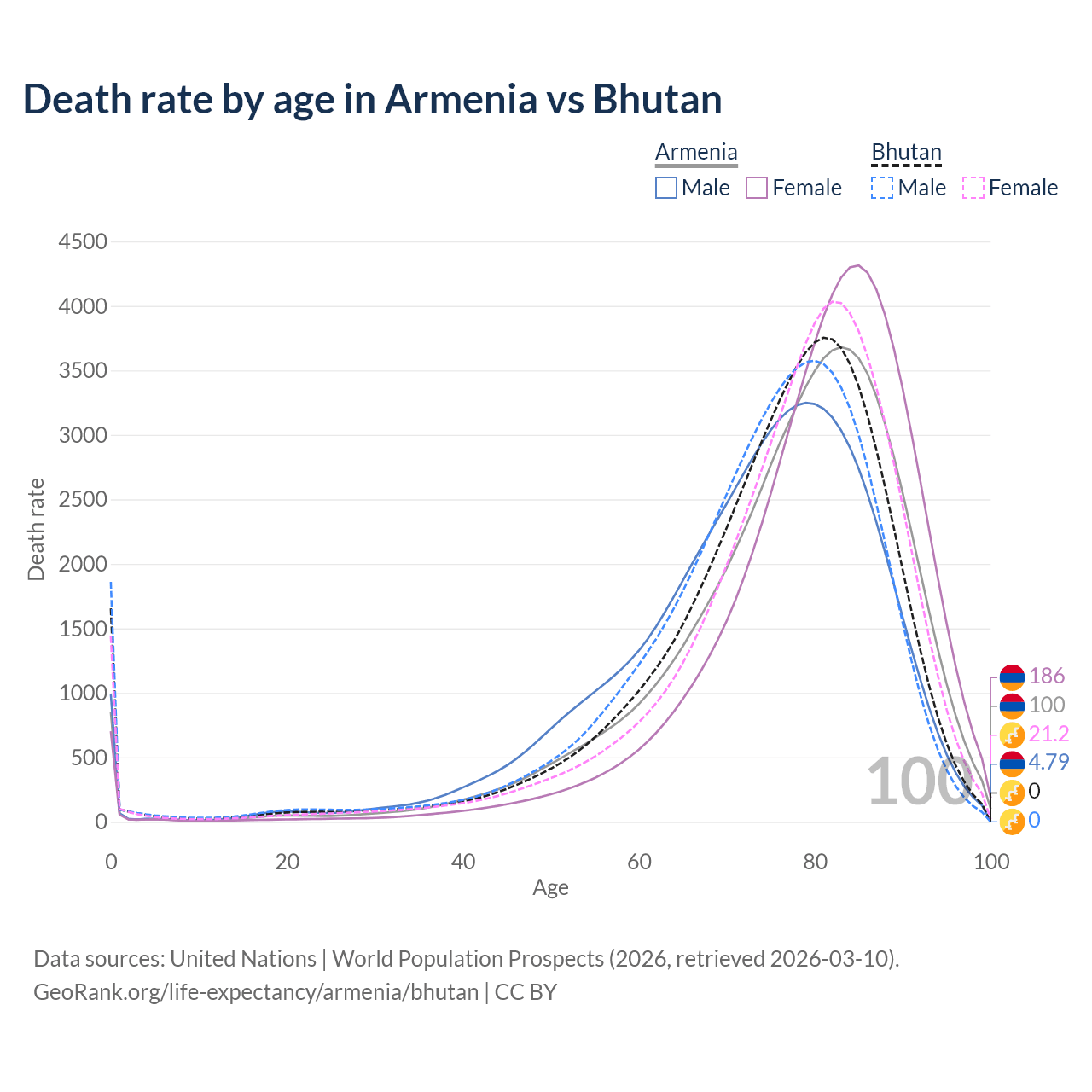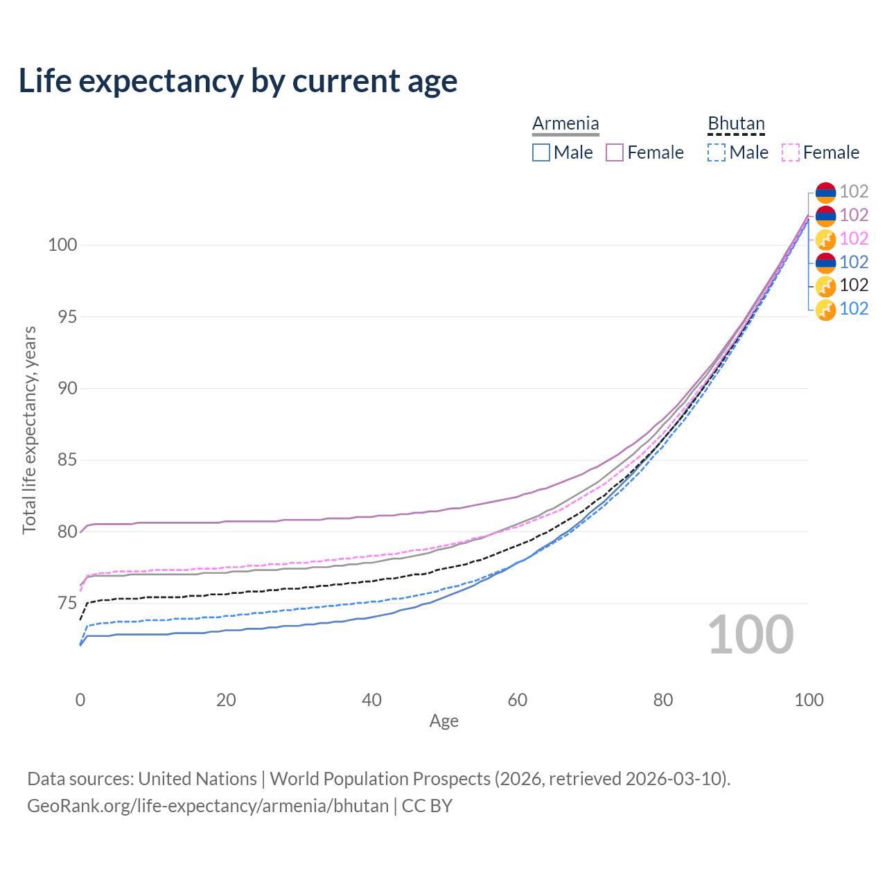This life expectancy calculator shows the odds of living to 100, 95, 90, and below based on current age for both males and females in Armenia and Bhutan, along with mean and median age of death. The calculations are based on the 2026 life tables (actuarial tables) from the UN World Population Prospects.