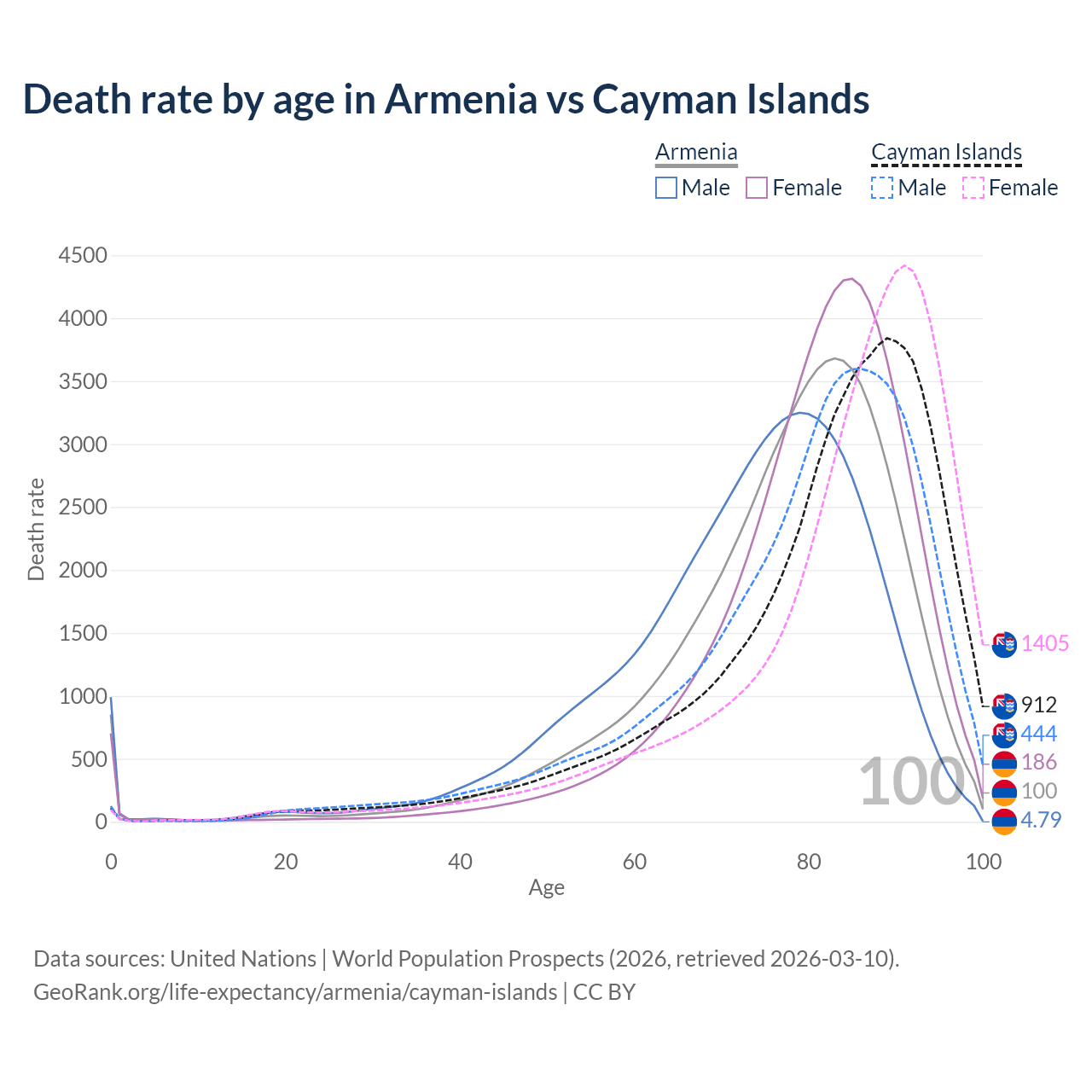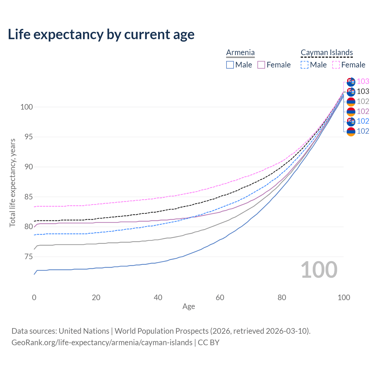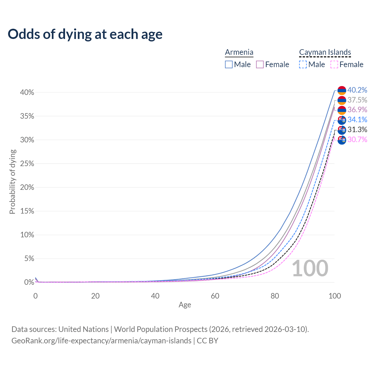 This life expectancy calculator shows the odds of living to 100, 95, 90, and below based on current age for both males and females in Armenia and the Cayman Islands, along with mean and median age of death. The calculations are based on the 2026 life tables (actuarial tables) from the UN World Population Prospects.