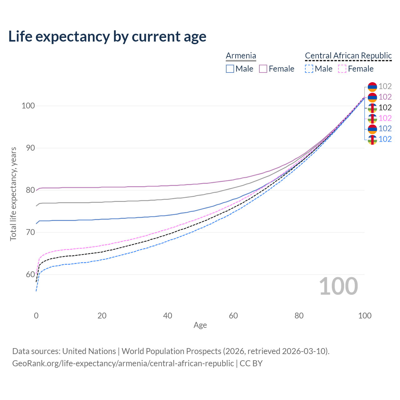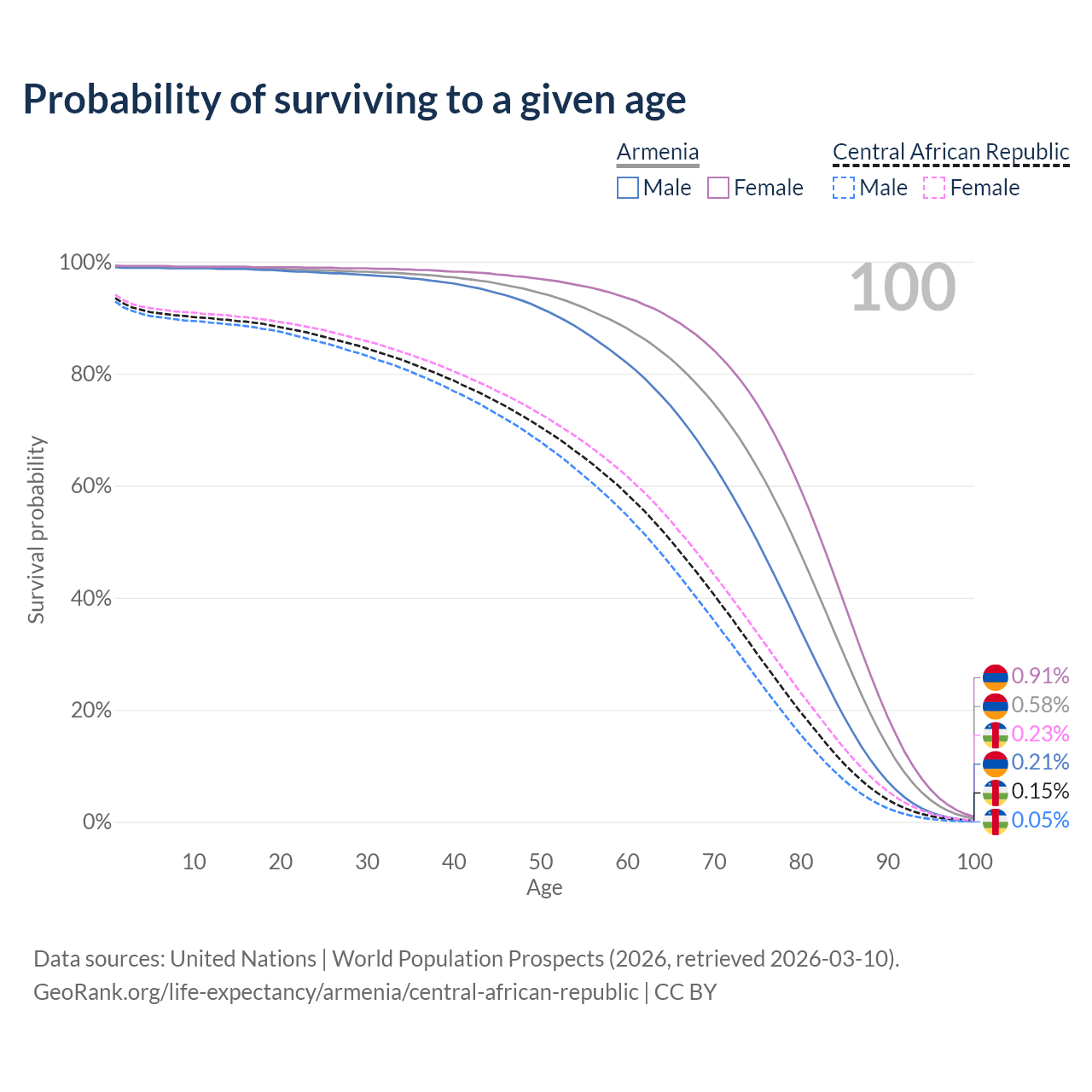 This life expectancy calculator shows the odds of living to 100, 95, 90, and below based on current age for both males and females in Armenia and the Central African Republic, along with mean and median age of death. The calculations are based on the 2026 life tables (actuarial tables) from the UN World Population Prospects.